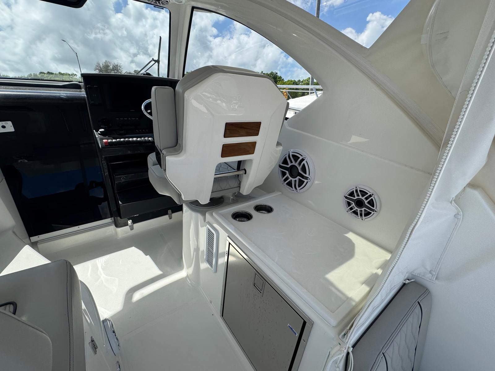 Practicality is at the core of the Pursuit OS 325’s design. The Yamaha Joystick Control with Set Point and Autopilot makes docking and maneuvering in tight spaces a breeze, reducing stress and increasing confidence for captains of all experience levels. The dedicated storage for the teak table ensures that your deck remains uncluttered, while the stowable sunshade can be easily deployed or stored as needed.The air conditioning systems in both the cabin and cockpit provide relief on hot days, making overnight stays or long cruises more enjoyable. The thoughtfully arranged seating and ample storage options make it easy to bring along everything you need for a day of fishing, swimming, or simply relaxing on the water. The Pursuit OS 325 is designed to make every aspect of boat ownership easier and more enjoyable, from maintenance to maneuverability.