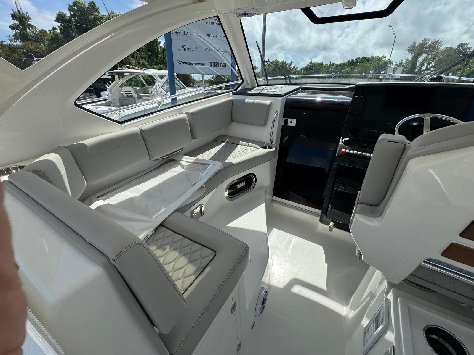 The Pursuit OS 325 is packed with special features designed to enhance your time on the water. The stowable Bow Mediterranean Style Sunshade provides ample shade for relaxing on sunny days, while the Bridgedeck Teak Table with dedicated storage offers a perfect spot for alfresco dining or socializing with guests. Both cabin and cockpit air conditioning ensure that you and your passengers stay cool and comfortable, no matter the weather. The thoughtfully designed helm, with its carbon finish, provides intuitive control and excellent visibility, making every voyage safe and enjoyable.The upholstery in Sea Salt and Tranquil Sea not only adds to the boat’s aesthetic appeal but also offers superior comfort for long days on the water. Every detail, from the hull’s fresh white finish to the black bootstripe, has been carefully considered to create a cruiser that is as beautiful as it is functional.