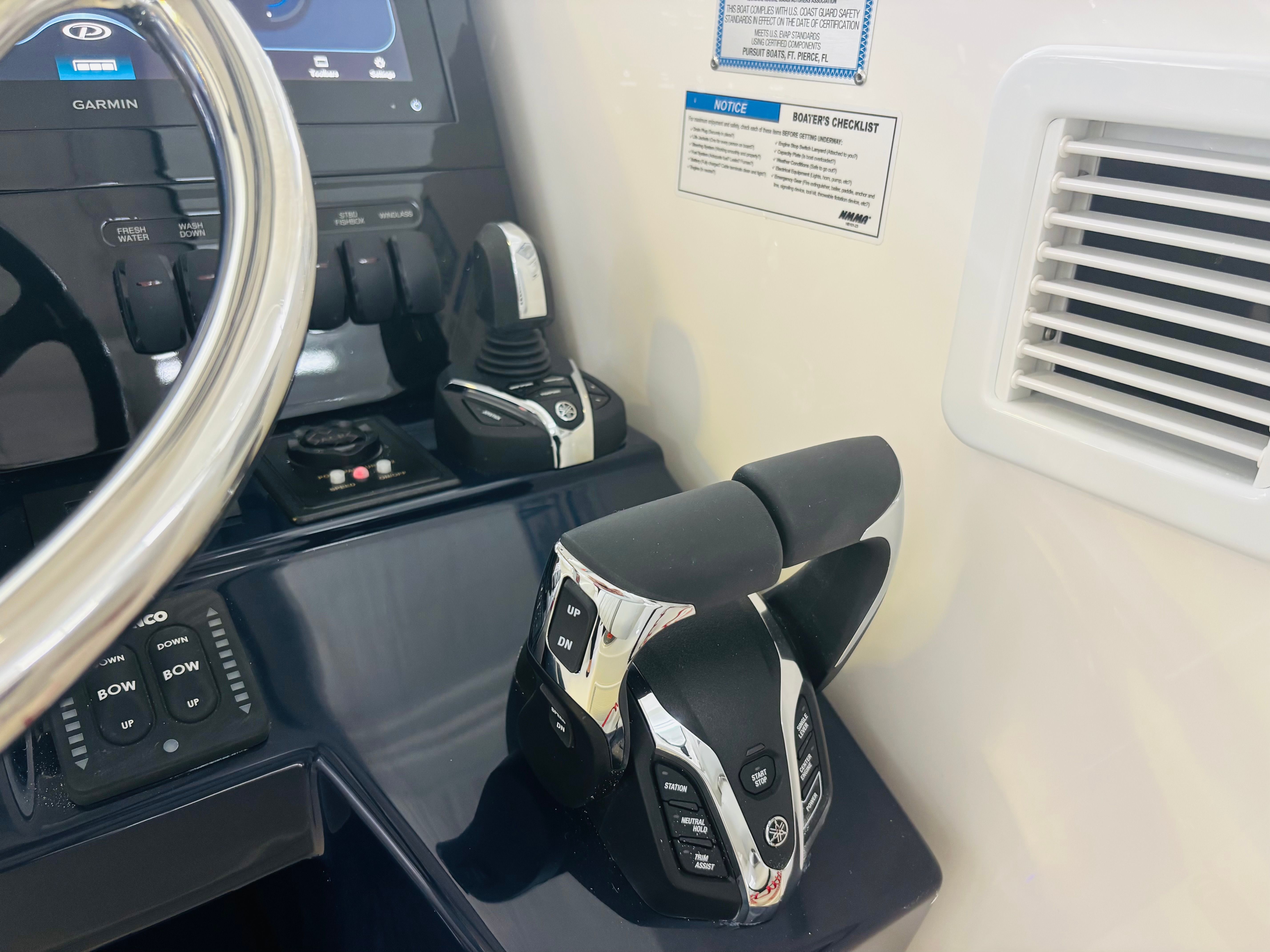 Power and precision are at the heart of the Pursuit OS 325. Equipped with twin Yamaha Digital F350 V6 Offshore engines in a stunning Pearlescent White finish, this cruiser delivers a combined 700 horsepower for exhilarating acceleration and smooth cruising. The integrated Digital Electric Steering (DES) ensures responsive handling, while the Helm Master EX Digital Electronic Control (DEC) system provides seamless throttle and shift operations. The advanced Yamaha Joystick Control, featuring full maneuverability with Set Point and Autopilot functions, offers effortless docking and precise navigation, making every journey as enjoyable as the destination. The Multifunction Display Interface keeps you informed and in control, enhancing your confidence on the water.