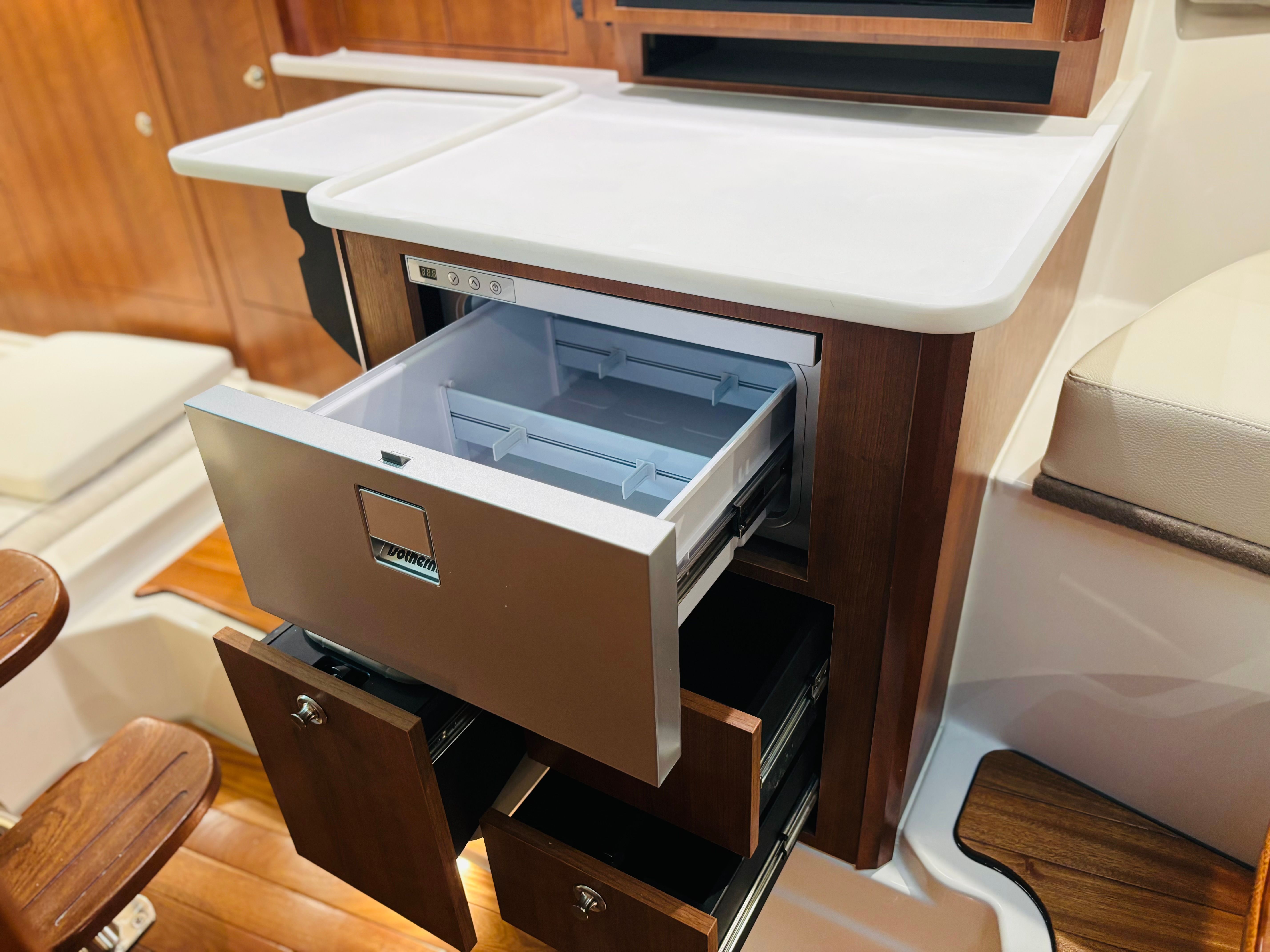 Beyond its luxurious amenities, the Pursuit OS 325 is engineered for practical, everyday enjoyment. The advanced Yamaha Joystick Control with full maneuverability and autopilot functions makes docking and tight maneuvers effortless, reducing stress and increasing safety. The Multifunction Display Interface provides real-time information at your fingertips, helping you navigate with confidence and ease.Storage is thoughtfully integrated throughout the boat, allowing you to bring along all the gear and supplies you need for a day on the water or an extended adventure. The efficient generator and air conditioning systems ensure that you can enjoy all the comforts of home, even when you are miles from shore. The Pursuit OS 325’s design also prioritizes fuel efficiency, helping you make the most of every trip without compromising on performance.