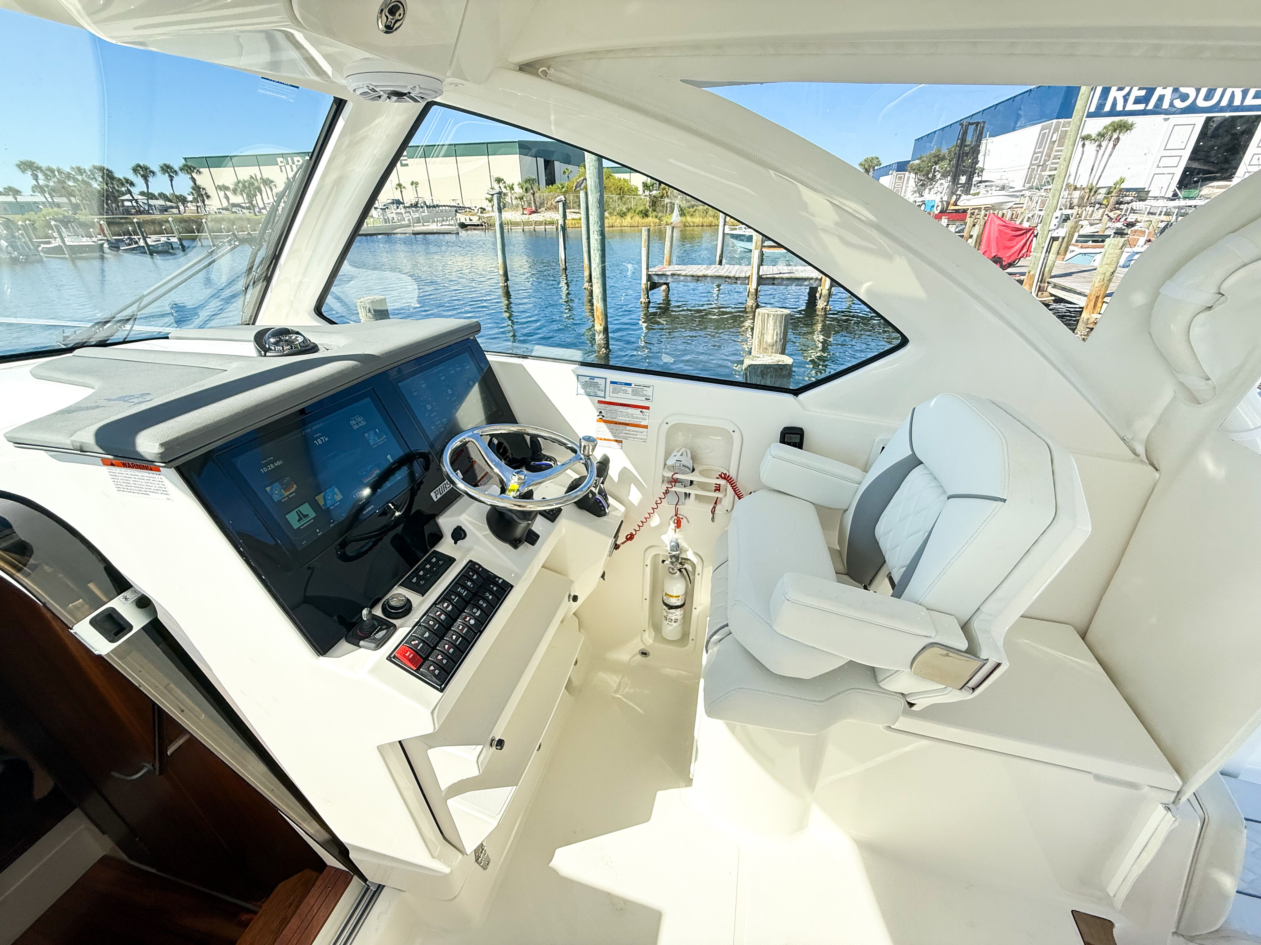 The Pursuit OS 355 is designed with practicality in mind, making ownership both easy and enjoyable. The Yamaha Joystick Control and Helm Master EX system simplify docking and maneuvering, allowing you to navigate marinas and tight slips with confidence. The manual engine flushing system streamlines maintenance, helping you protect your investment and maximize engine longevity. Ample storage throughout the boat means you can bring along everything you need for a day on the water or an extended cruise. The electric retractable sunshade and climate-controlled cockpit ensure comfort in any weather, while the forward deck sunpad offers a perfect spot for sunbathing or relaxing with a book.