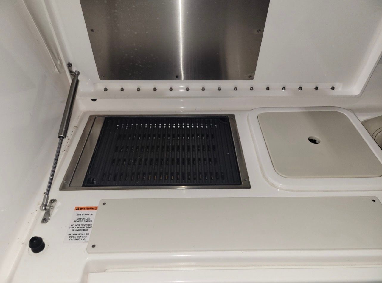 Step aboard the Pursuit 355 OS and you’ll immediately notice the attention to detail in its features and specifications. The aft bench seat provides a comfortable spot for guests to relax and take in the views, while the aft drop curtain offers protection from the elements, ensuring your outings remain enjoyable regardless of the weather. The cockpit is a true highlight, featuring a Sea Deck carpet that adds both style and comfort underfoot. The cockpit cover keeps your boat protected when not in use, preserving its pristine condition. For those who love to entertain, the cockpit grill is perfect for preparing delicious meals on the water, and the cockpit wet bar makes serving drinks a breeze. Ample cockpit storage ensures you have plenty of space to stow gear and supplies, keeping the deck clutter-free. The elegant cabinetry adds a touch of luxury to the interior, providing both functionality and aesthetic appeal. With a battery charger included, you can rest assured that your electronics and systems will remain powered throughout your adventures.