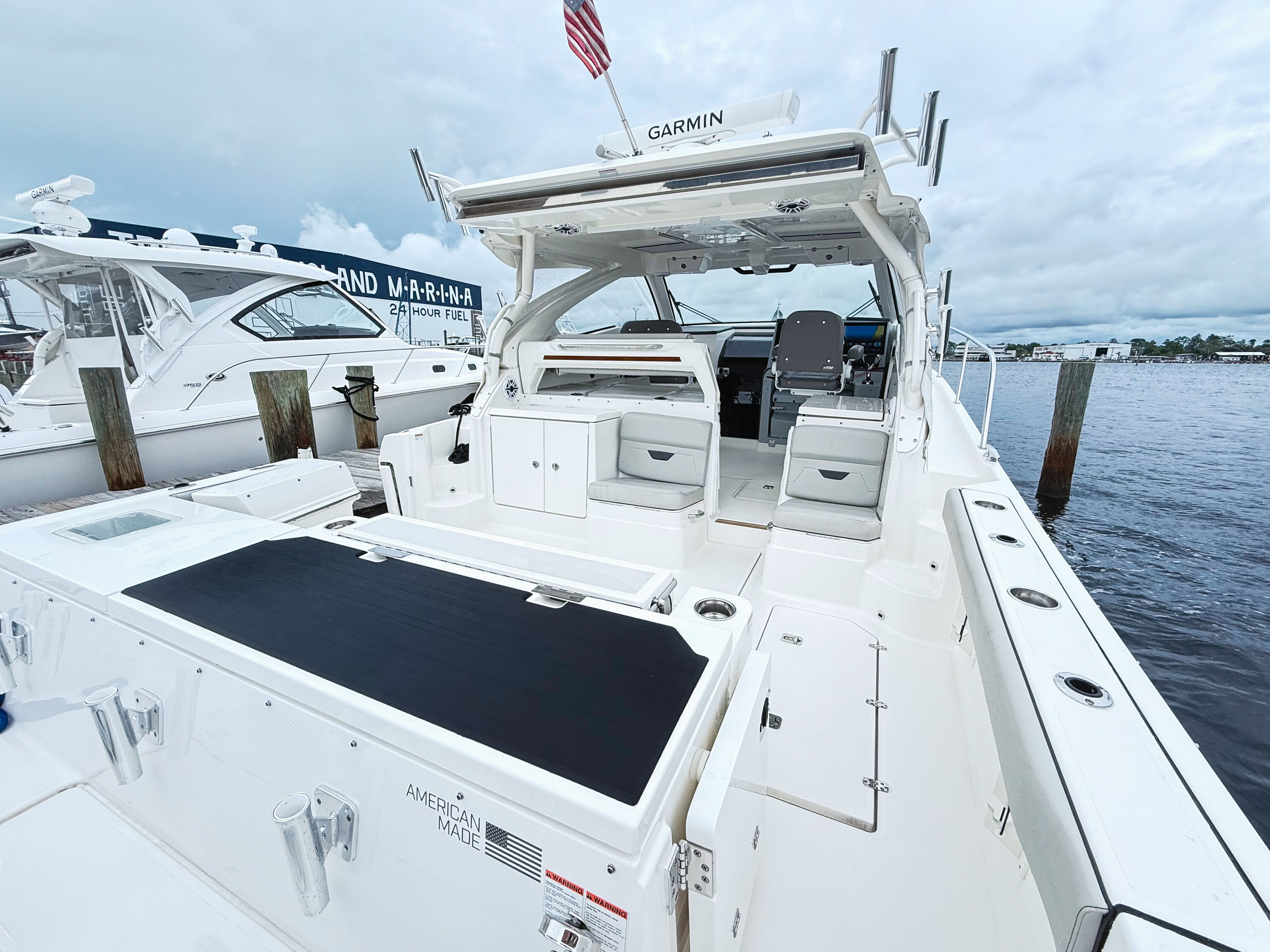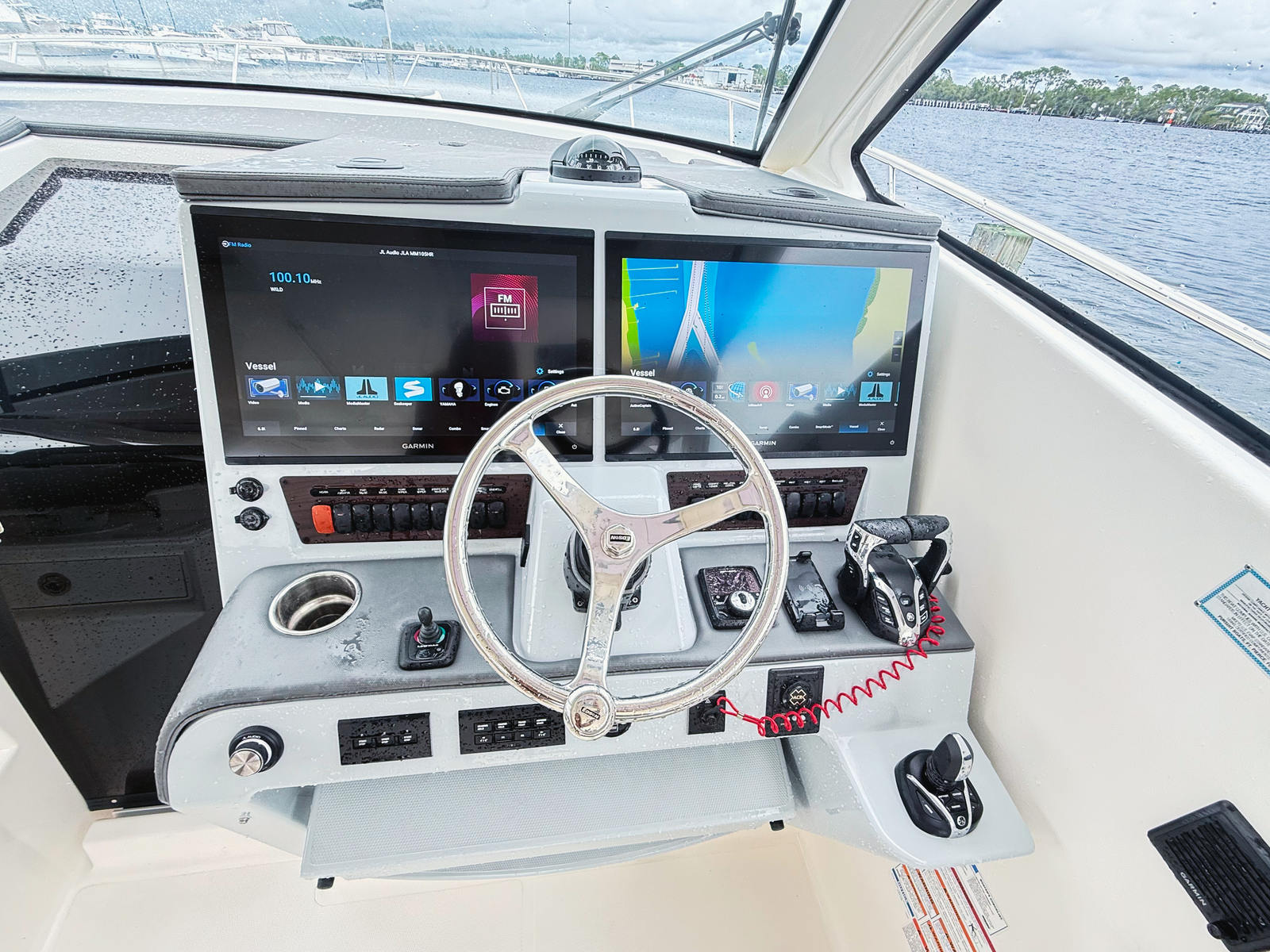 The Pursuit OS 405 is loaded with special features designed to enhance your time on the water. The black instrument cover adds a touch of sophistication to the helm, while the SiriusXM Receiver for Weather (subscription required) keeps you informed of changing conditions, ensuring safe and enjoyable voyages. Anglers will appreciate the hardtop-mounted rod holders, which provide convenient storage and quick access to your fishing gear.Entertainment is taken to the next level with the premium stereo upgrade, delivering crystal-clear sound throughout the boat. The hardtop aft curtain upgrade in white Stamoid offers added protection from the elements, allowing you to enjoy your time on deck in comfort, regardless of the weather. Four Sea Blaze X2 Spectrum LED underwater lights create a mesmerizing ambiance for evening cruises or dockside gatherings, illuminating the water with vibrant colors.Navigation and safety are enhanced by the Garmin GC-14 rear-facing camera and the Garmin Radar Open Array GMR Fantom 54, providing advanced situational awareness and peace of mind during every journey. The helm, finished in Neptune Gray, and the platinum bootstripe add a touch of elegance and modern style to the OS 405’s exterior.