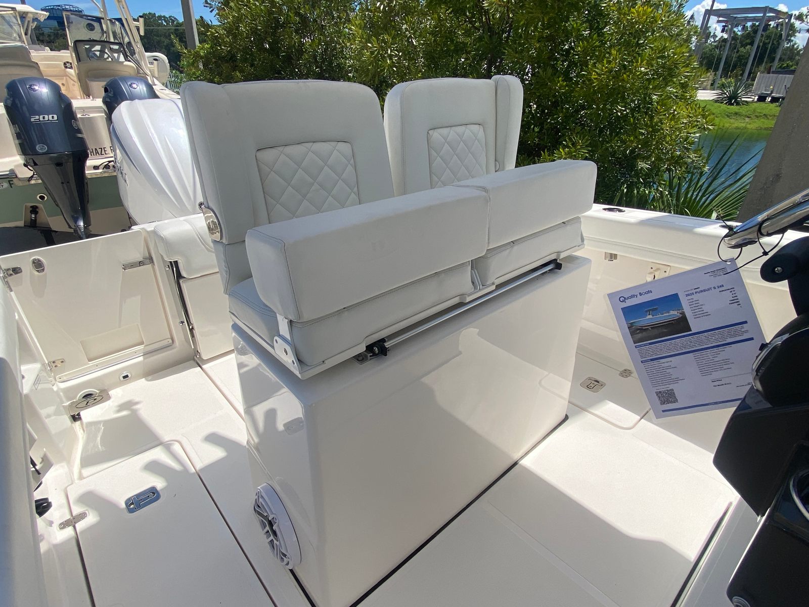 The Pursuit S 248 is packed with premium features that enhance both functionality and comfort. One of the standout amenities is the forward Med style sunshade, which is stowable and crafted by Suntex, providing excellent protection from the sun while maintaining an open and airy feel on deck. The bow seating area is equipped with port and starboard backrests, offering plush comfort for lounging or socializing with friends and family.A standard hardtop with select canvas options ensures you are shielded from the elements, while the hardtop liner in fresh white adds a touch of elegance to the overall design. The fresh potable water system, complete with an 18-gallon tank, ensures you have access to clean water for rinsing off or staying hydrated during long days on the water.For those who appreciate advanced technology, the Pursuit S 248 features a Garmin widescreen 12-inch display package, providing intuitive navigation and real-time data at your fingertips. The console is further enhanced with a stainless steel portlight, adding both style and ventilation. The cadet gray instrumentation cover protects your controls and electronics, keeping them in pristine condition.Entertainment is taken to the next level with a premium stereo system, amplifier, and speakers, complete with Sirius satellite radio capability. Blue LED accent lights at mid-level (four in total) create a sophisticated ambiance for evening cruises or dockside gatherings.