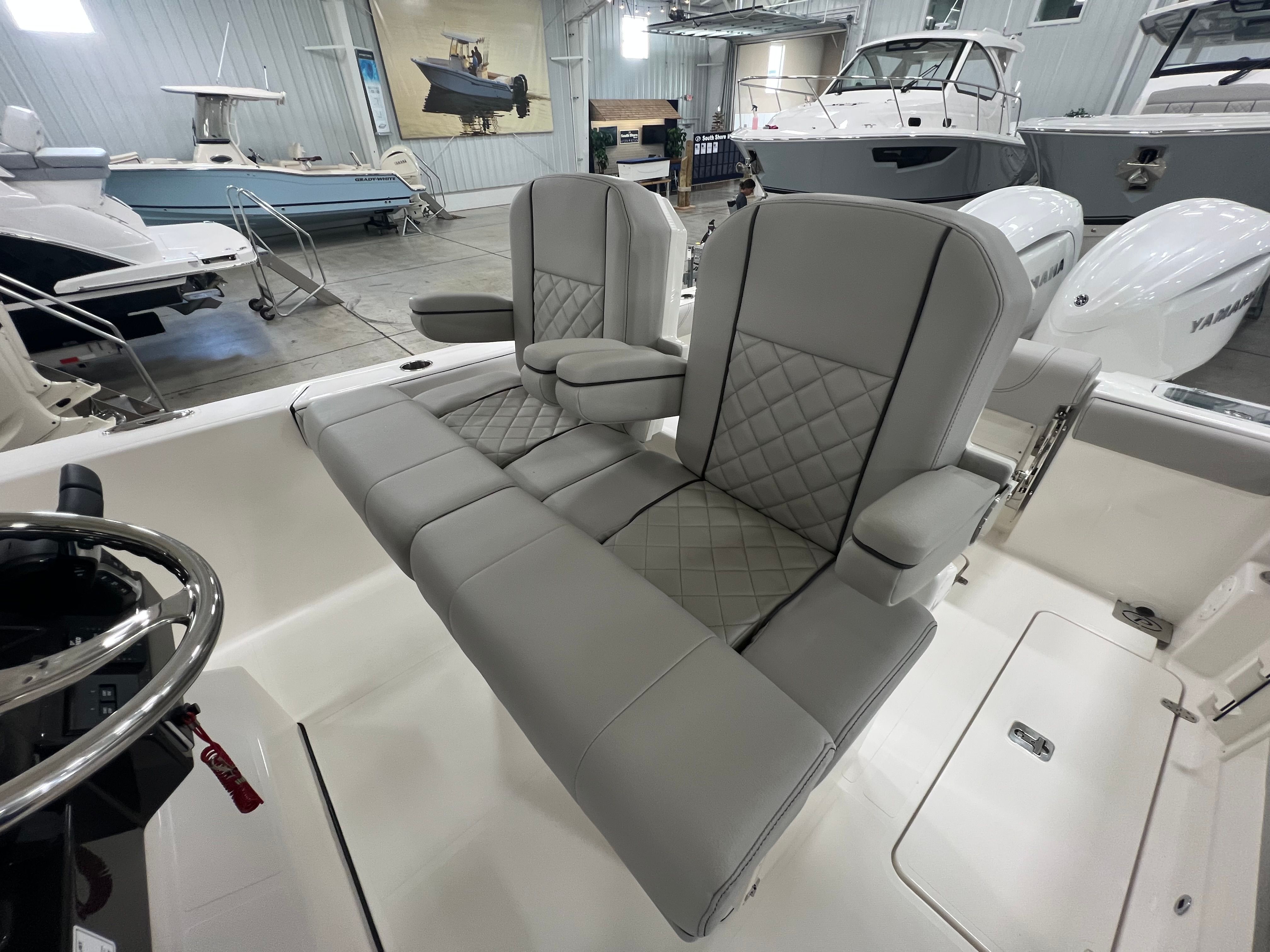 - Premium Helm Seating w/Four (4) Folding Armrests, Articulating Flip-up Bolsters, Upgraded Seat Slide with Fore/Aft Adjustments, and Edson® 316L SS Steering Wheel with Control Knob and Non-Slip Grip