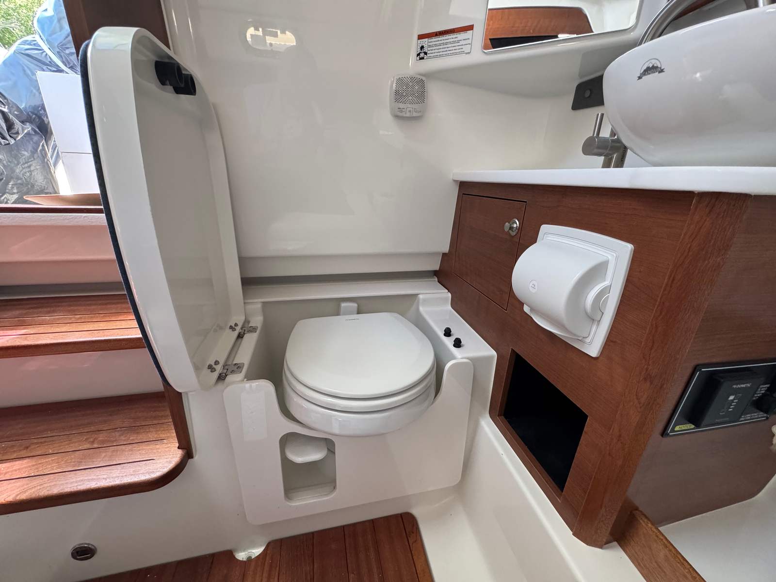 - Helm - Premium Upgrade: Edson Solid Teak Steering Wheel with Power Knob, Leather-Wrapped Dash Pad (Black), Synthetic Teak Flooring on Helm Footrest Treads and Teak Accents on Dash Storage Pockets and Entertainment Center