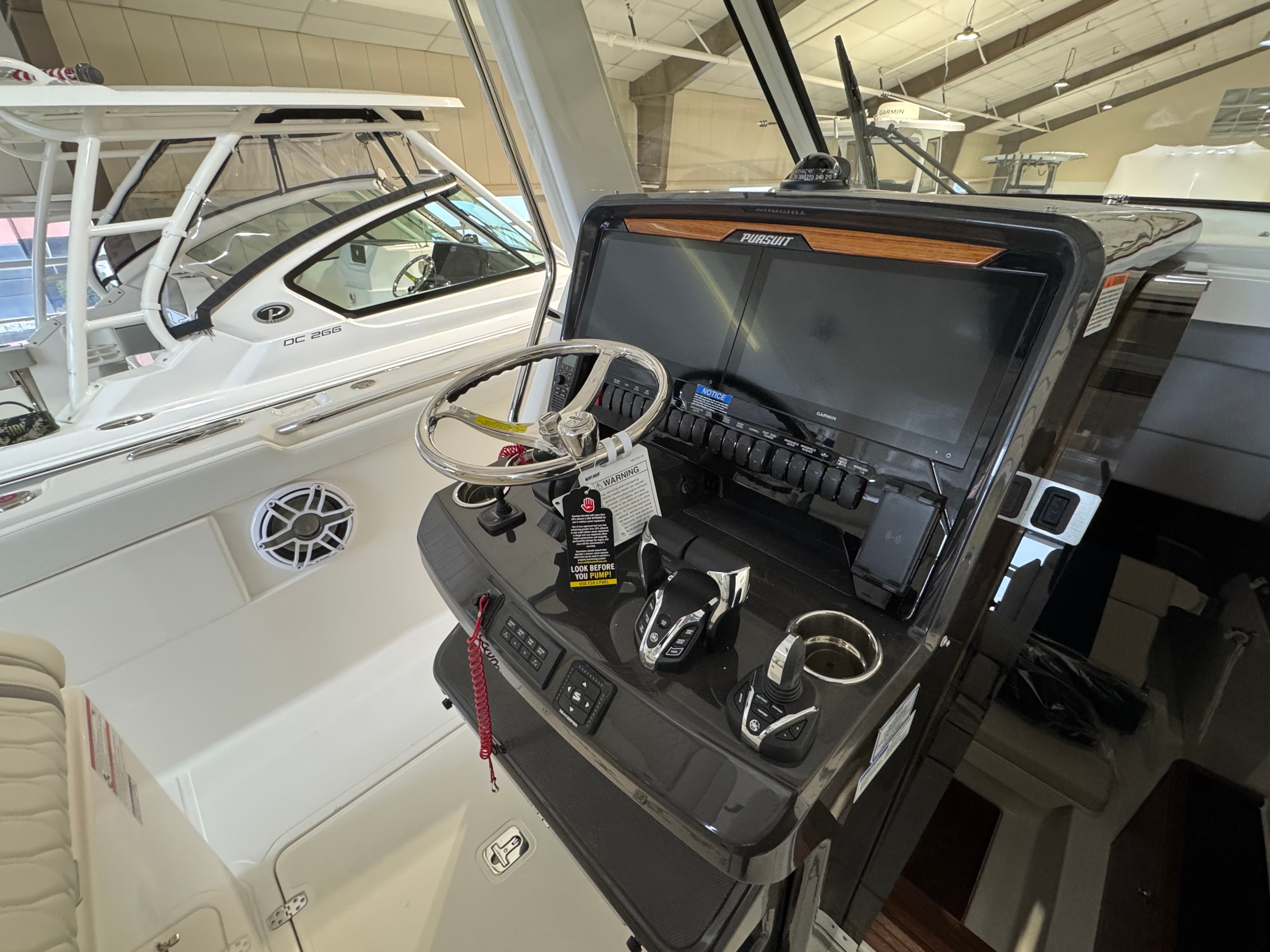 The 2026 Pursuit S 328 is packed with features that elevate your boating experience. The twin Yamaha F350 engines are renowned for their power and efficiency, making them a top choice for serious boaters. The Seakeeper Ride Attitude Control System is a game-changer, minimizing pitch and roll for a more enjoyable journey. The joystick control offers intuitive handling, making docking and close-quarters navigation a breeze. The hull’s fresh white color, complemented by the black boot stripe and accent, gives the boat a timeless yet contemporary look. The helm console’s carbon finish and the hardtop liner’s fresh white color add to the vessel’s modern aesthetic. The white exterior vinyl upholstery sport and tranquil sea interior provide a luxurious and comfortable environment for you and your guests. For added convenience, the cockpit drawer 12V refrigerator keeps your refreshments cool and easily accessible during your outings.