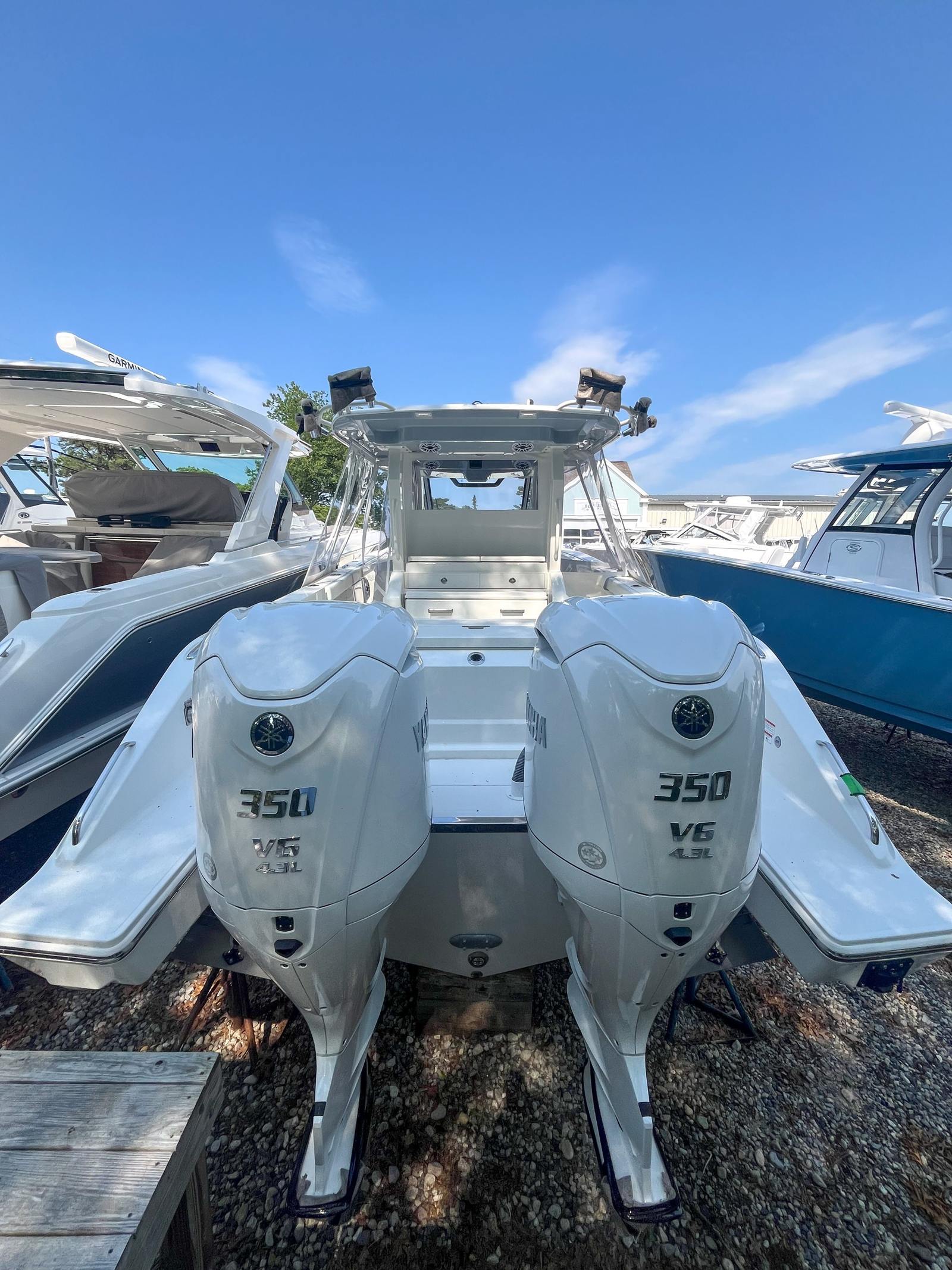 - Twin Yamaha® Digital F350 V6 Offshore (Pearlescent White) w/Integrated Digital Electric Steering (DES) and Helm Master® EX Digital Electronic Control (DEC) (does not include joystick control) and Multifunction Display Interface