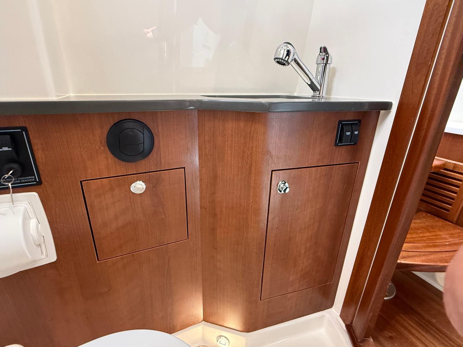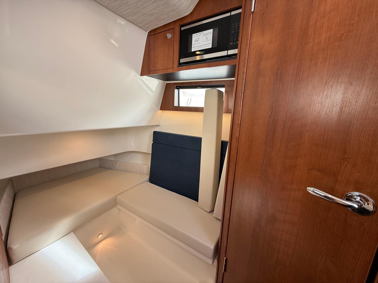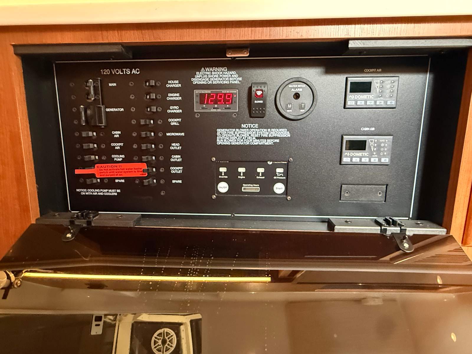 - Generator 120V/60Hz (5.0kW Fischer Panda Genset (16 gal diesel tank), Includes one GFI Outlet and 0.7 cu. Ft. Microwave (replaces upper storage in cabin)
