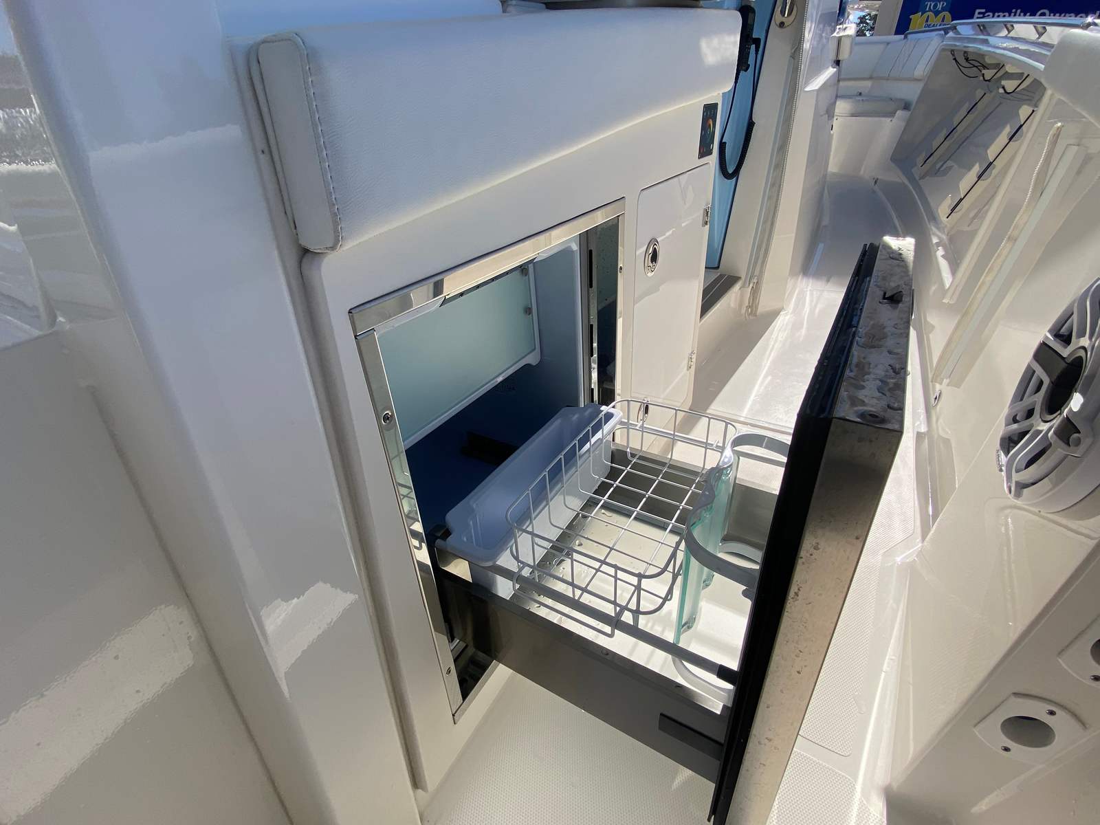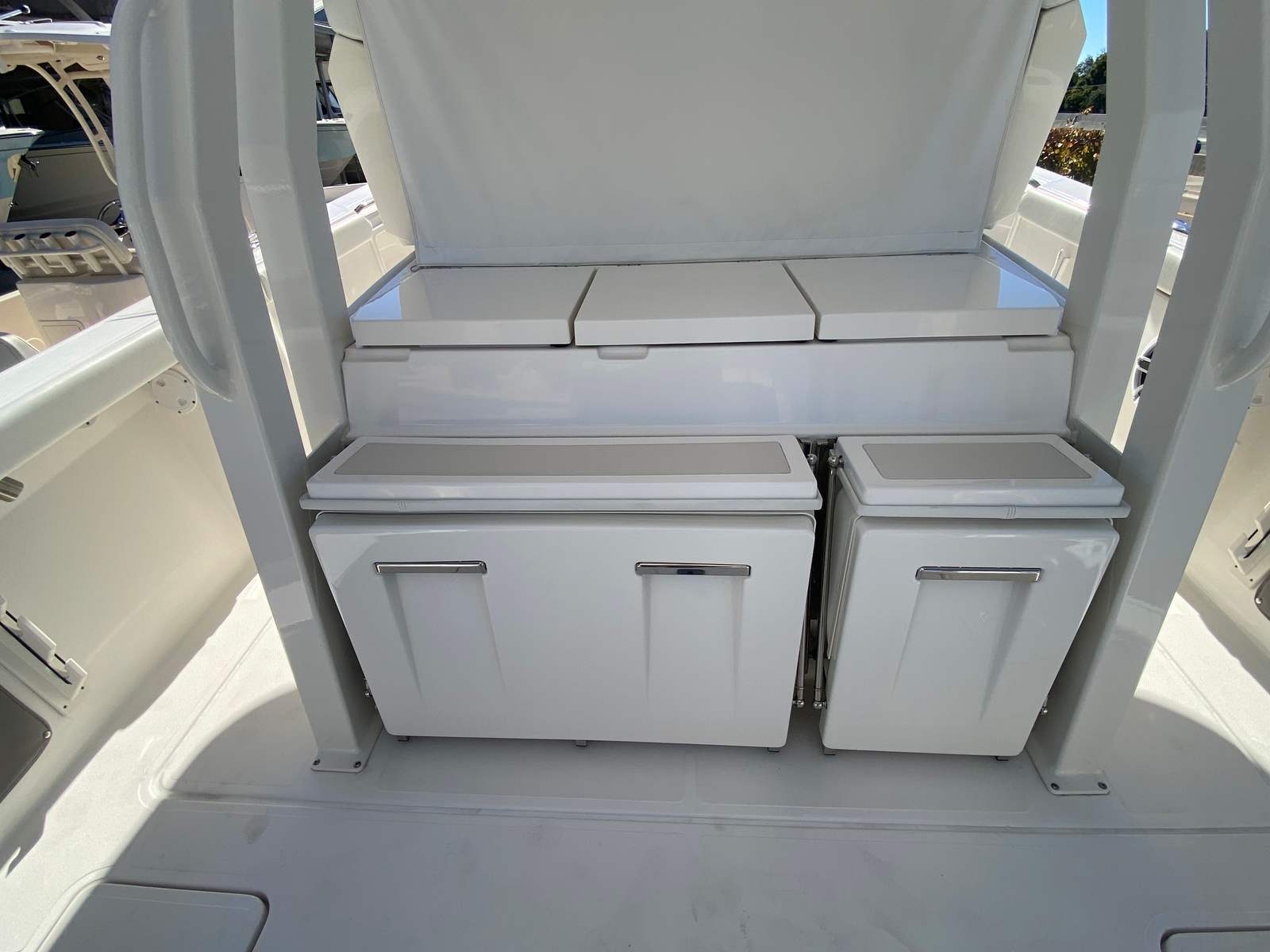 The Pursuit S 358 Center Console is packed with premium features that elevate your boating experience. The Arctic Blue hull is complemented by a black bootstripe with a black accent, creating a visually stunning profile. The helm and footrest are finished in a sleek carbon color, while the hardtop liner shines in fresh white, adding to the boat’s contemporary aesthetic. Step aboard and you’ll be greeted by the Tranquil Sea Interior Package, which enhances comfort and style throughout the vessel.For those who love to soak up the sun, the forward Mediterranean style sunshade (stowable) by Suntex offers flexible protection, allowing you to enjoy the outdoors while staying cool and comfortable. The three-sided enclosure, crafted from Stamoid and Makrolon materials, provides shelter from wind and spray, making it easy to extend your boating season and enjoy the water in a variety of conditions. The Garmin GXM 54 Sirium SXM Weather Receiver keeps you informed with real-time weather updates, ensuring safe and enjoyable outings. A white Stamoid instrument cover adds a finishing touch, protecting your helm controls and maintaining the boat’s pristine appearance.