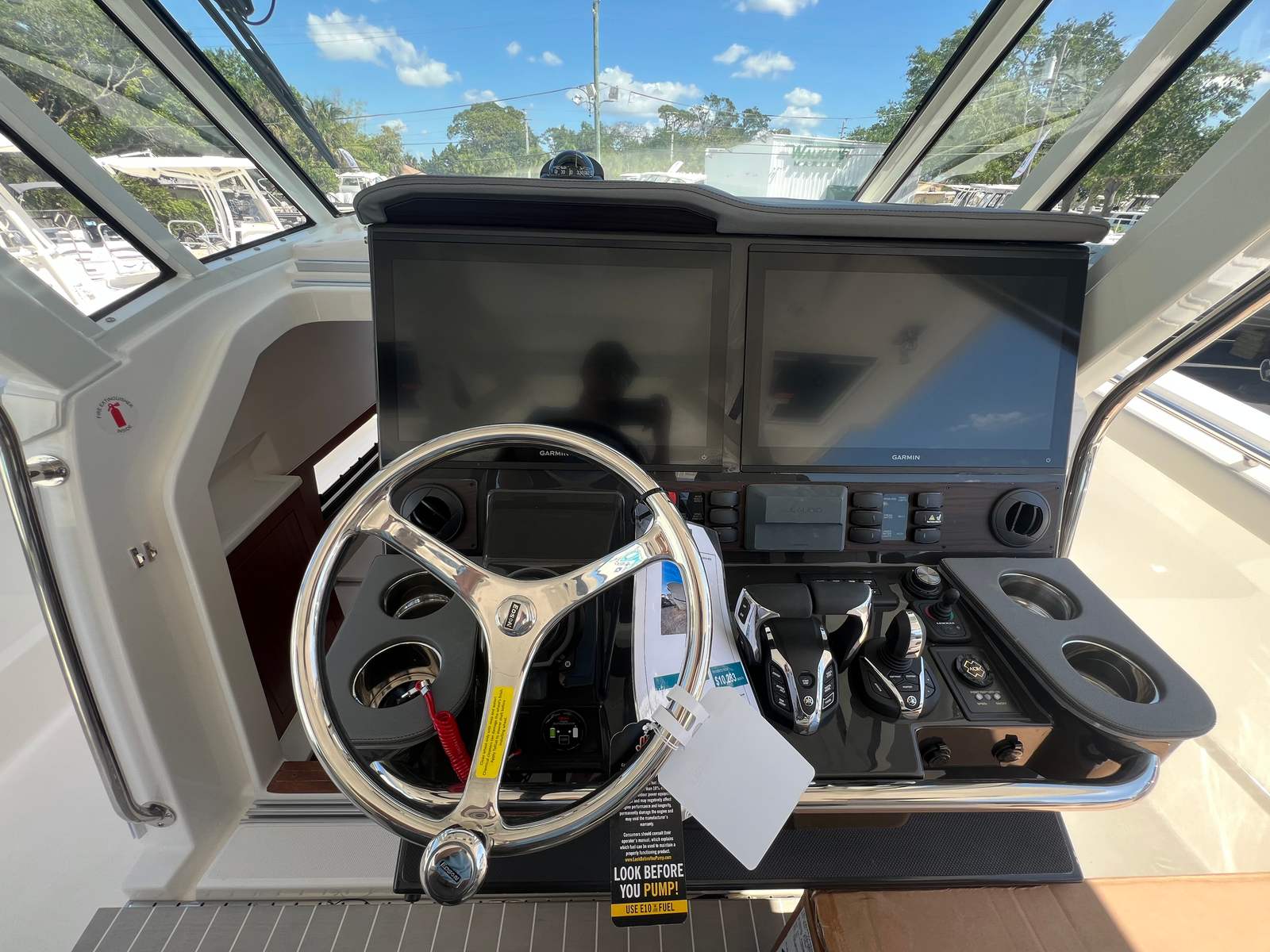 The 2025 Pursuit S 428 is loaded with premium features that enhance both safety and enjoyment on the water. The Garmin 72Mile GMR Fantom Radar Array offers advanced navigation and situational awareness, making it easy to explore new destinations with confidence. The Seakeeper Gyro Stabilization System is a game-changer for comfort, virtually eliminating boat roll and ensuring a stable, enjoyable experience for everyone on board, even in choppy conditions.For those who appreciate comfort and protection from the elements, the electric retractable cockpit sun shade provides instant relief from the sun, allowing you to create the perfect environment for relaxation or entertaining guests. The boat’s aesthetic appeal is further elevated by the navy boot stripe with navy accent, while the hardtop liner in fresh white adds a touch of modern elegance.To protect your investment and keep your boat looking pristine, the S 428 comes equipped with a suite of high-quality covers, including the White Stamoid LT instrument cover, aft facing seat cover, console chaise cover, and helm/comp seat cover. The blue quad engine covers not only enhance the boat’s visual appeal but also provide essential protection for the powerful engines.