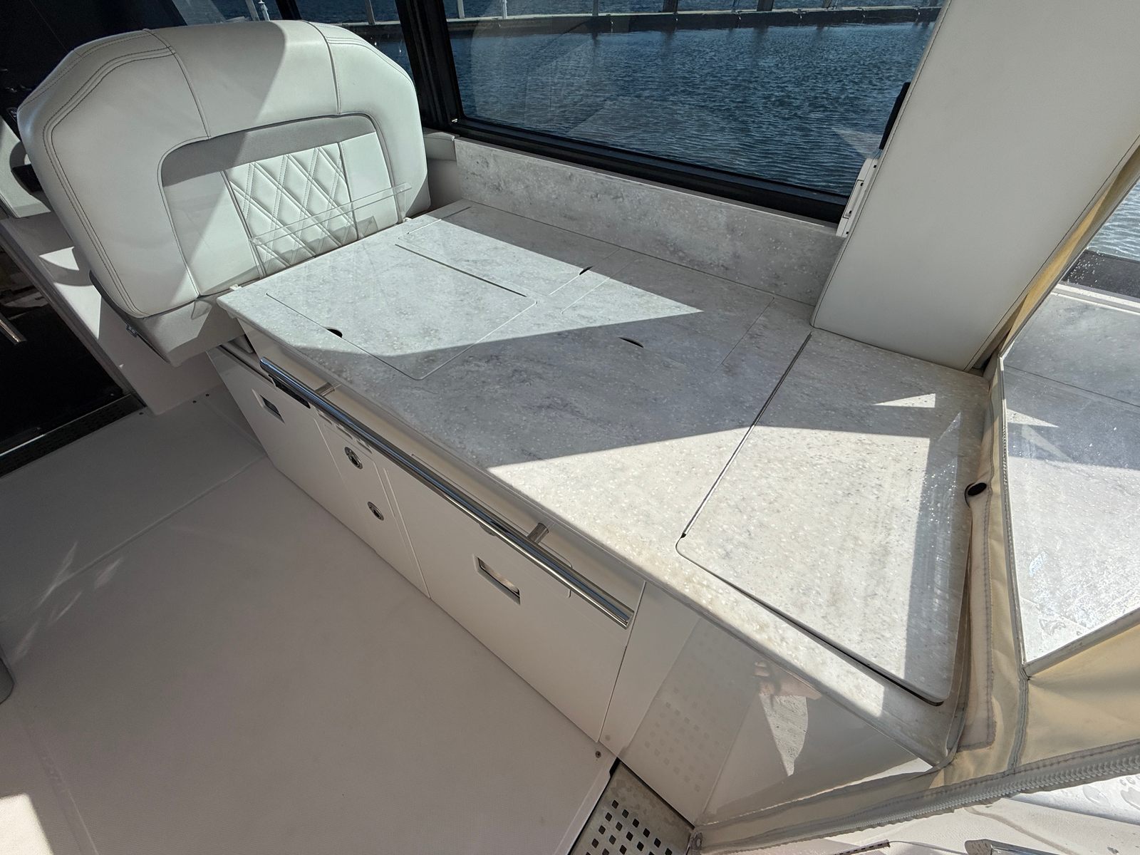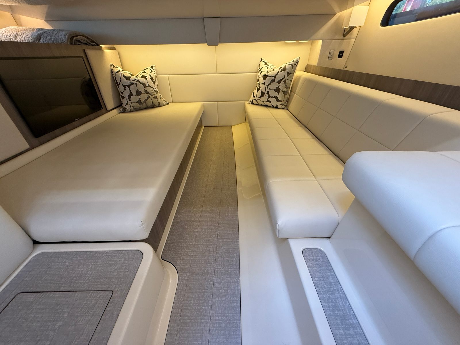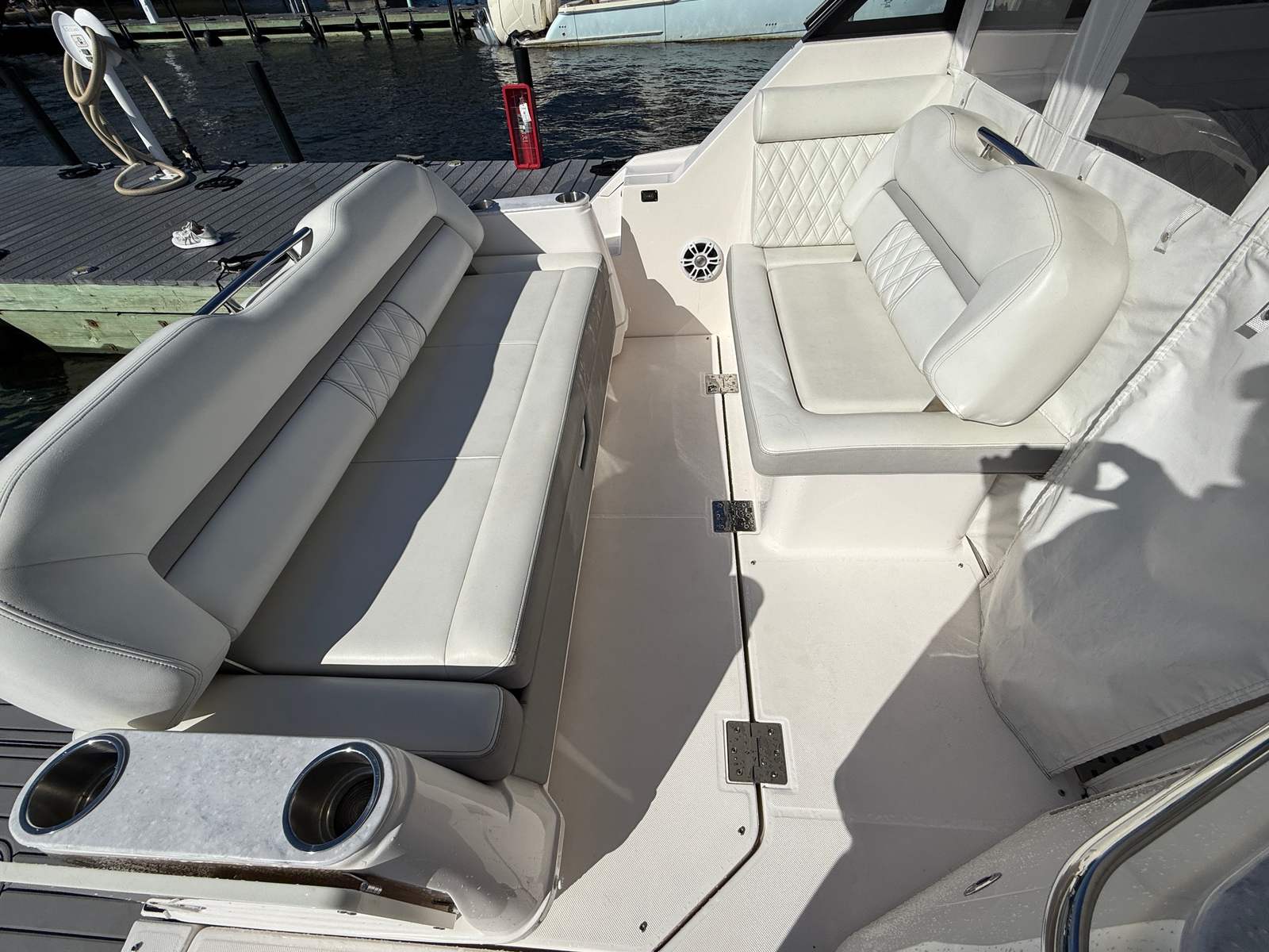 Under the hood, the 2021 Regal 36 Grande Coupe is powered by twin engines, delivering a combined 700 horsepower. With 528 engine hours, these engines have been well maintained and are ready to provide reliable performance for many more adventures. The robust powertrain ensures smooth acceleration, responsive handling, and the ability to cruise effortlessly at a variety of speeds. Whether you are navigating open waters or docking at your favorite waterfront restaurant, the 36 Grande Coupe offers the confidence and control you expect from a premium cruiser boat for sale.