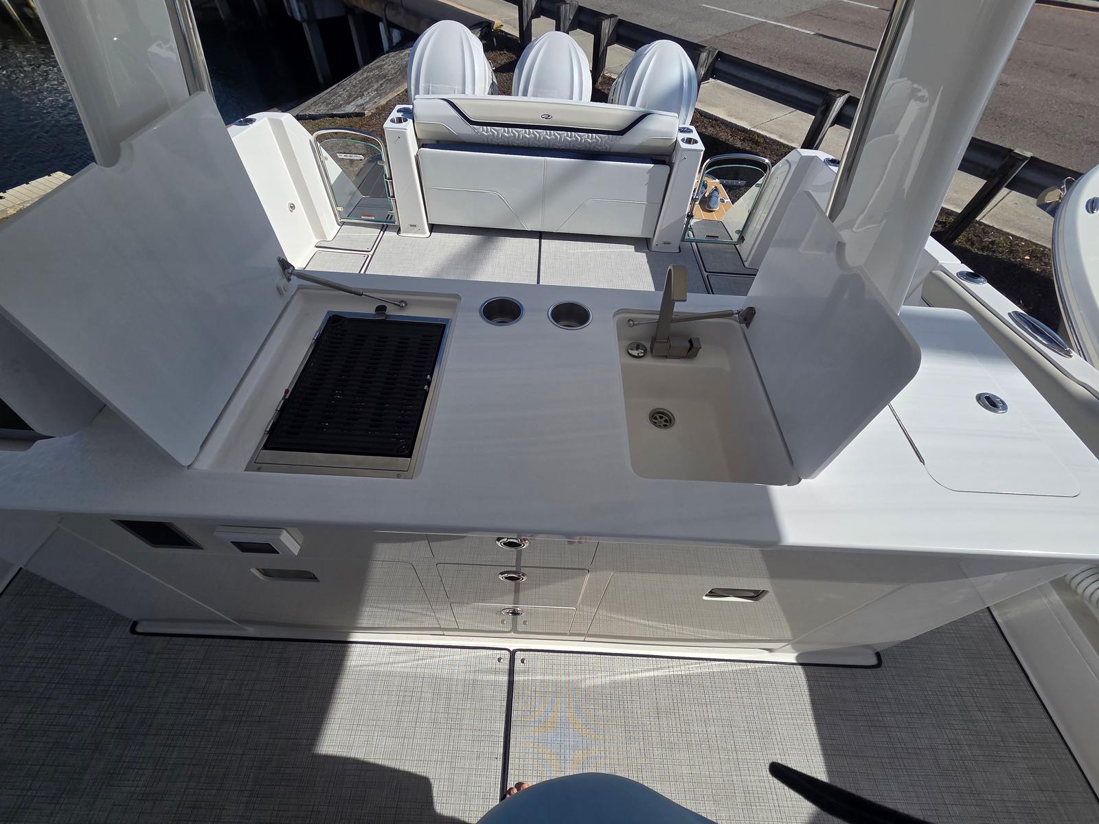 Practicality is at the heart of the Regal 38 SAV’s design. The yacht’s spacious layout offers plenty of storage for gear, water toys, and personal belongings, keeping the deck clutter-free and organized. The anchor windlass system simplifies docking and anchoring, saving you time and effort. The cockpit refrigerator ensures your snacks and beverages are always within reach, while the overboard discharge toilet adds convenience for longer journeys.The convertible transom seat allows you to adapt the seating arrangement for different activities, whether you are sunbathing, fishing, or enjoying a meal with friends. Fender clips make it easy to secure your fenders when docking, protecting your yacht and giving you peace of mind. The yacht’s efficient design and powerful engines also contribute to a smooth, enjoyable ride, making it easy to explore new destinations or return to your favorite spots with ease.