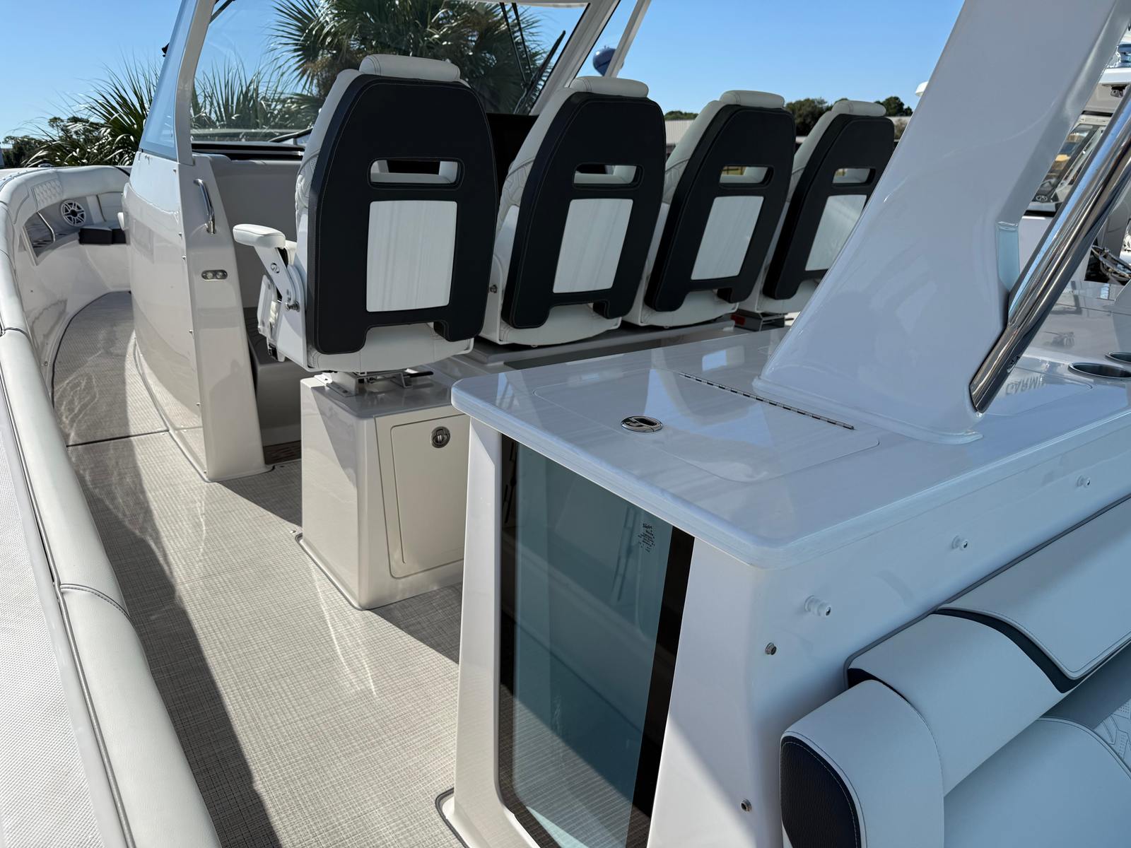 The Regal 38 SAV is packed with special features that elevate your boating experience to new heights. The triple Yamaha F300NSB2 engines provide unmatched power and efficiency, while the integrated steering system ensures precise control. The hull’s Steel Grey finish, Graphite bootstripe, and Tahiti Beach White bottom create a visually stunning exterior that reflects Regal’s commitment to quality and style. The multi-zone color scheme, featuring Pure White, Graphite, Lunar Grey, and Graphite Grey, adds depth and character to the yacht’s appearance, making it a true standout on the water. Every detail of the Regal 38 SAV is crafted to enhance both aesthetics and functionality, ensuring you enjoy every moment aboard.