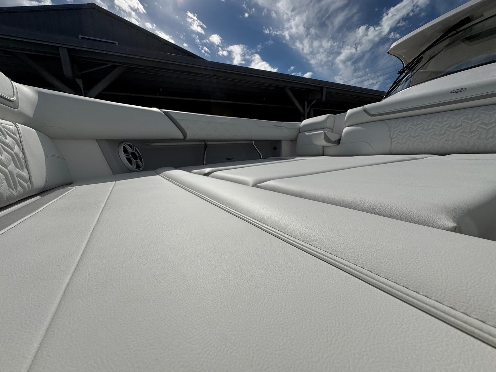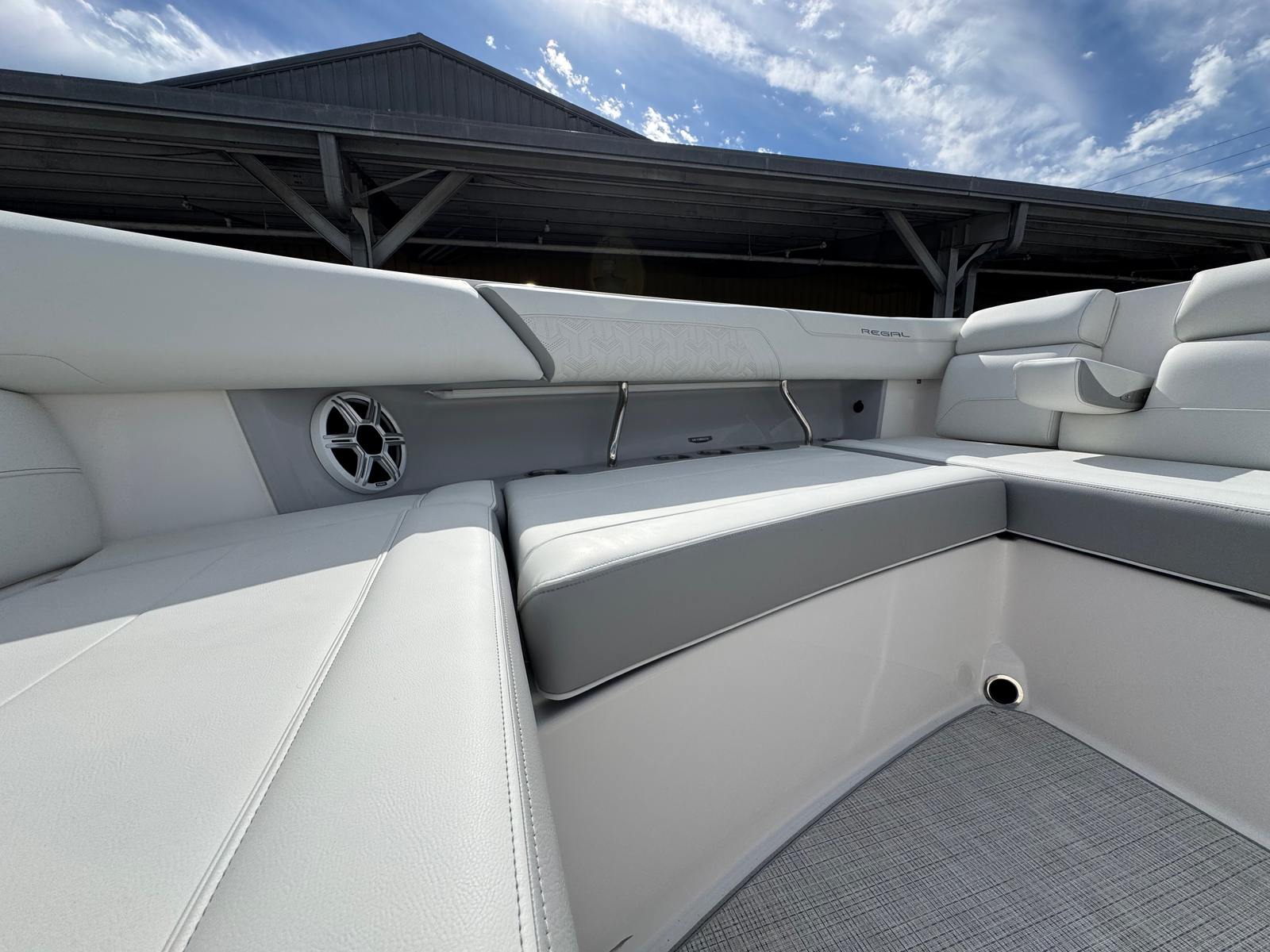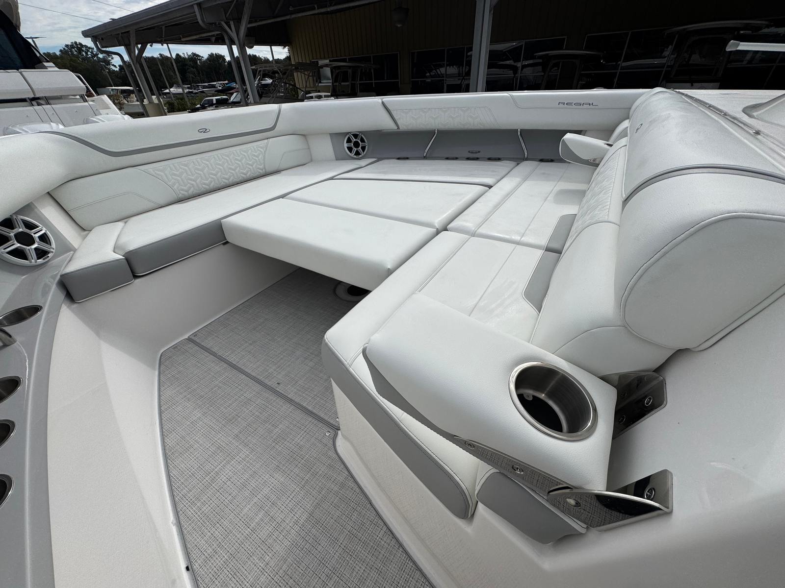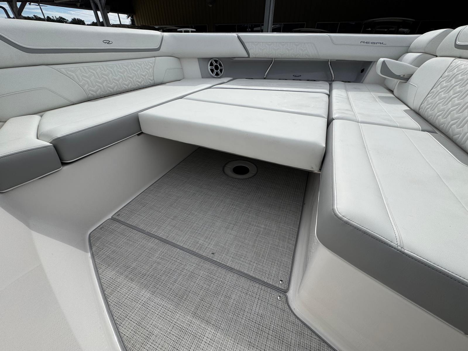 The Regal 38 SAV is designed with both style and functionality in mind. Its Steel Grey hull is complemented by a Graphite bootstripe, while the bottom color in Tahiti Beach White adds a touch of elegance. The yacht’s exterior zones are thoughtfully coordinated, featuring Pure White and Lunar Grey finishes that create a harmonious and modern look. The triple Yamaha 350 engines are a standout feature, providing unmatched power and reliability.Inside and out, the Regal 38 SAV offers a spacious and inviting environment. The open deck layout is perfect for socializing, with plenty of room for guests to relax and enjoy the scenery. The yacht’s design maximizes usable space, ensuring that every inch is both practical and luxurious. High-quality materials and finishes are used throughout, reflecting Regal’s commitment to excellence.