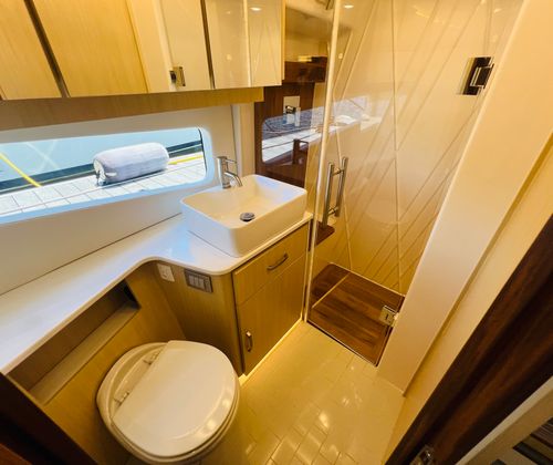 Step aboard the Regal 42 XO and discover a world of luxury and convenience. The forward stateroom features a toasted oak finish, creating a warm and inviting atmosphere for restful nights on the water. The yacht is equipped with an overboard discharge toilet and a second head, ensuring comfort and privacy for you and your guests. Advanced navigation is made easy with the Garmin HD Closed Array Radar and GPS 9222, complemented by the B60 transducer for precise location tracking and safety. The aft cockpit canvas with a transom seat cover provides protection and style, while the generator (diesel 110V) ensures reliable power for all your onboard needs. The aft vent in Tahiti Beach White adds a touch of elegance to the exterior, and the pillow package in neutral tones enhances comfort throughout the yacht.