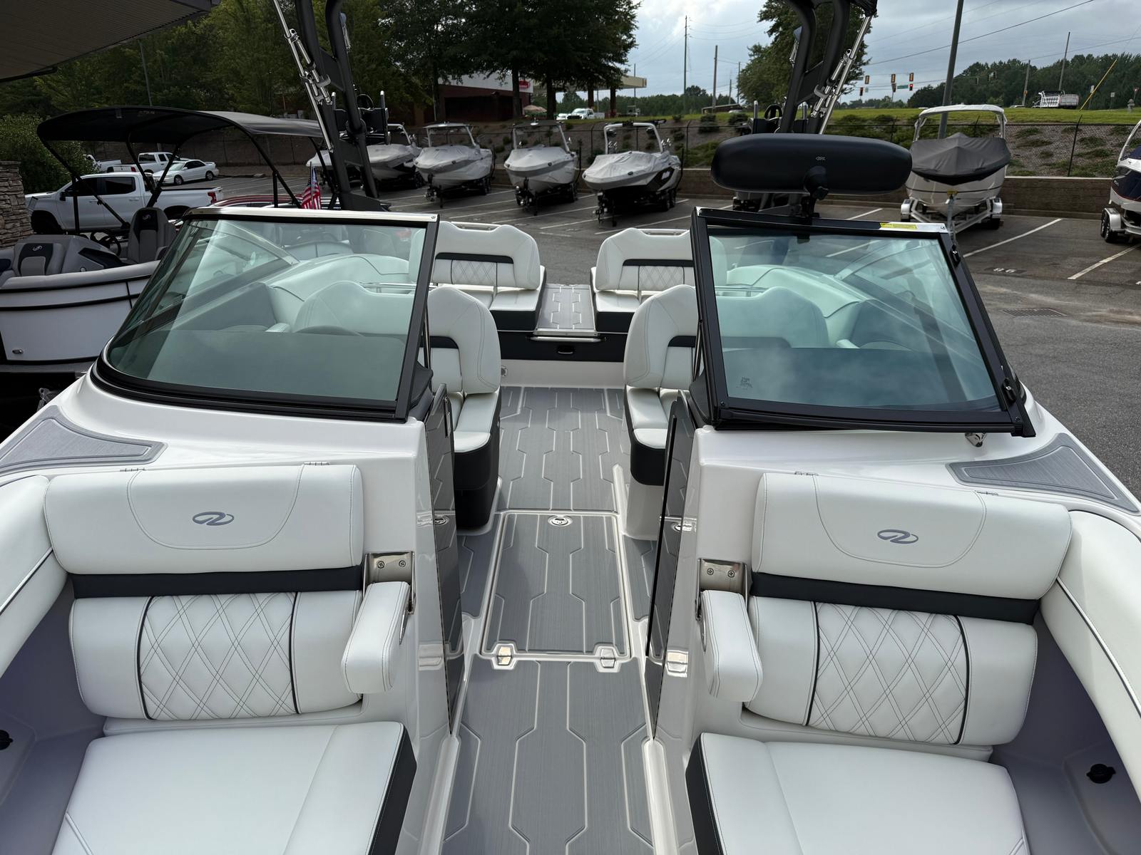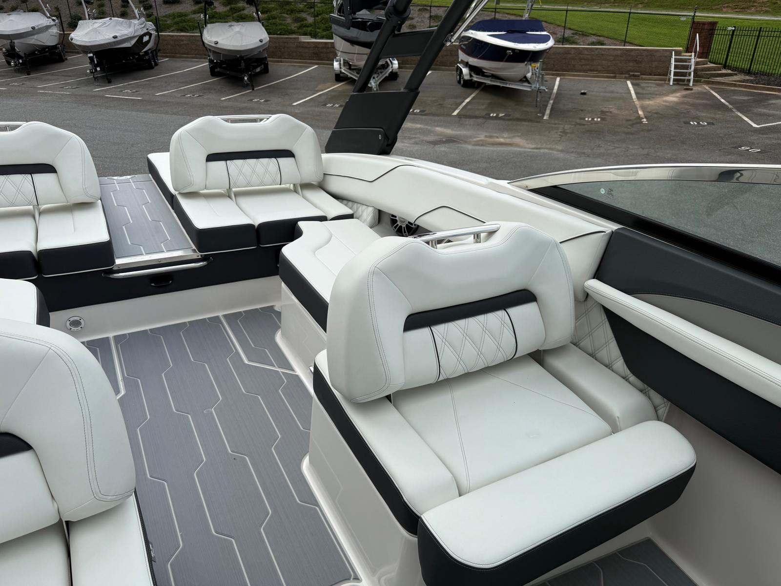 The LS4 Surf is packed with special features that set it apart from other Bowrider boats for sale. The Mediterranean Blue hull color is complemented by a striking Tahiti Beach White bootstripe, creating a sophisticated and eye-catching profile. Fender clips offer convenient docking and protection, while the watersport mirror ensures optimal visibility for drivers and spotters during active sessions. The SeaDek cockpit sole and SeaDek swim platform provide a soft, non-slip surface for added comfort and safety, whether you’re lounging or preparing for watersports.Bow walk-thru doors make moving between the bow and cockpit effortless, enhancing both safety and convenience. The stainless steel flag pole with a U.S. flag adds a touch of patriotic flair and elegance, while the black bottom color completes the boat’s modern aesthetic. Every detail of the LS4 Surf is designed to maximize enjoyment and usability, making it a standout choice for anyone seeking a Regal boat for sale with premium features.