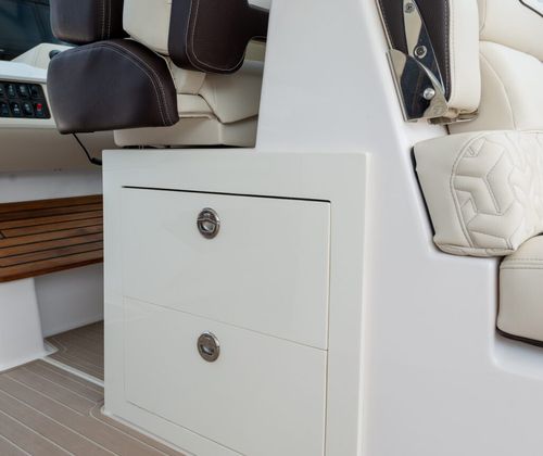 The Regal LX36 is designed with practicality in mind, making ownership as enjoyable as it is rewarding. The spacious bow and cockpit areas offer plenty of storage for gear, water toys, and personal items, keeping the deck clutter-free and organized. The boat’s length and hull design provide a stable and comfortable ride, even during longer journeys or when carrying a full complement of passengers.Docking and maneuvering are made simple with the integrated Bow Thruster, giving you precise control in tight spaces. The Anchor Windlass - All Chain system allows for quick and secure anchoring, so you can easily stop and enjoy your favorite spots. The efficient engine setup ensures you get the most out of every gallon of fuel, making the LX36 a smart choice for those who value both performance and economy.