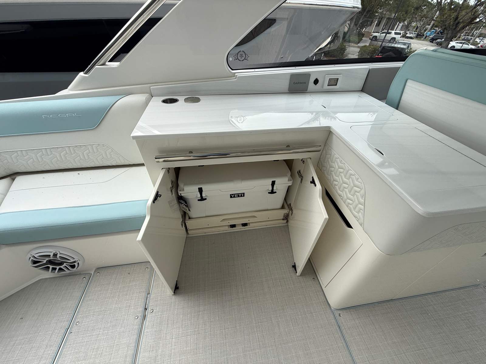 The 2025 Regal LX36 is packed with innovative features designed to enhance your boating experience. The quarter berth utility room offers versatile space for storage or relaxation, providing added convenience for longer trips or overnight stays. Navigation is a breeze with the companion Garmin 8616 and dual Garmin GPS8616XSV units, complemented by a B60 transducer for precise depth and fish-finding capabilities. The digital switching system streamlines onboard controls, allowing you to manage lighting, systems, and more with the touch of a button.For those who appreciate comfort and protection from the elements, the aft cockpit canvas with a Palm Beach enclosure and white canvas provide shade and shelter, ensuring you can enjoy your time on the water regardless of the weather. The cockpit drawer system adds practical storage solutions, keeping your gear organized and easily accessible. The Z1PWS Pure White standard finish and PowerShade system further elevate the LX36’s appeal, offering both style and functionality.