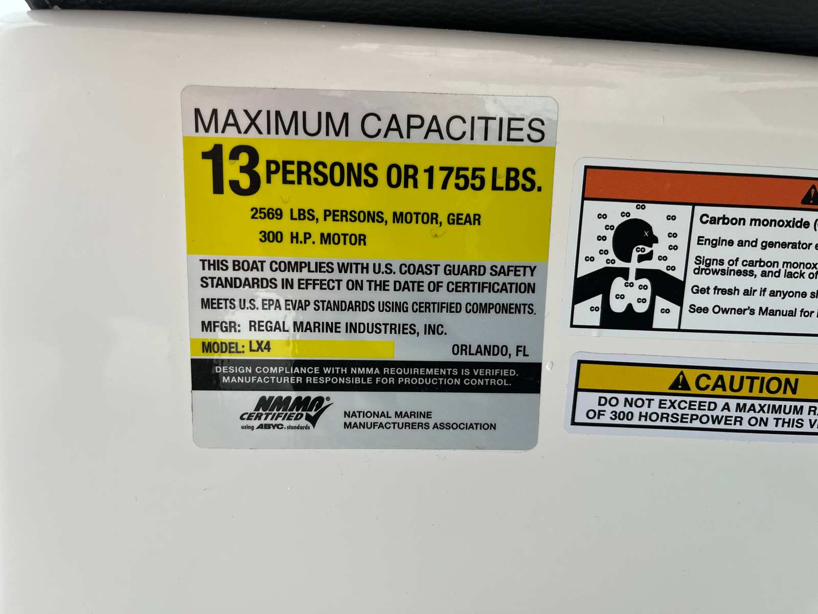 The 2025 Regal LX4 is loaded with special features designed to enhance your time on the water. The striking Tahiti Beach White and Black exterior, complemented by Titanium accents, gives this bowrider a modern and sophisticated look that is sure to turn heads wherever you go. Bow and cockpit covers in Black Canvas provide protection from the elements, keeping your boat looking pristine and ready for action.For added convenience and peace of mind, the LX4 is equipped with a dual battery switch with tray and cables, ensuring reliable power management for all your onboard systems. The battery charger keeps your batteries topped up and ready for extended adventures, while the bow thruster offers precise control when docking or maneuvering in tight quarters.The transom shower and pressure water package add a touch of luxury, allowing you and your guests to rinse off after a swim or simply freshen up during a day on the water. Every feature is thoughtfully integrated to enhance comfort, convenience, and enjoyment, making the LX4 a standout choice among bowrider boats for sale.