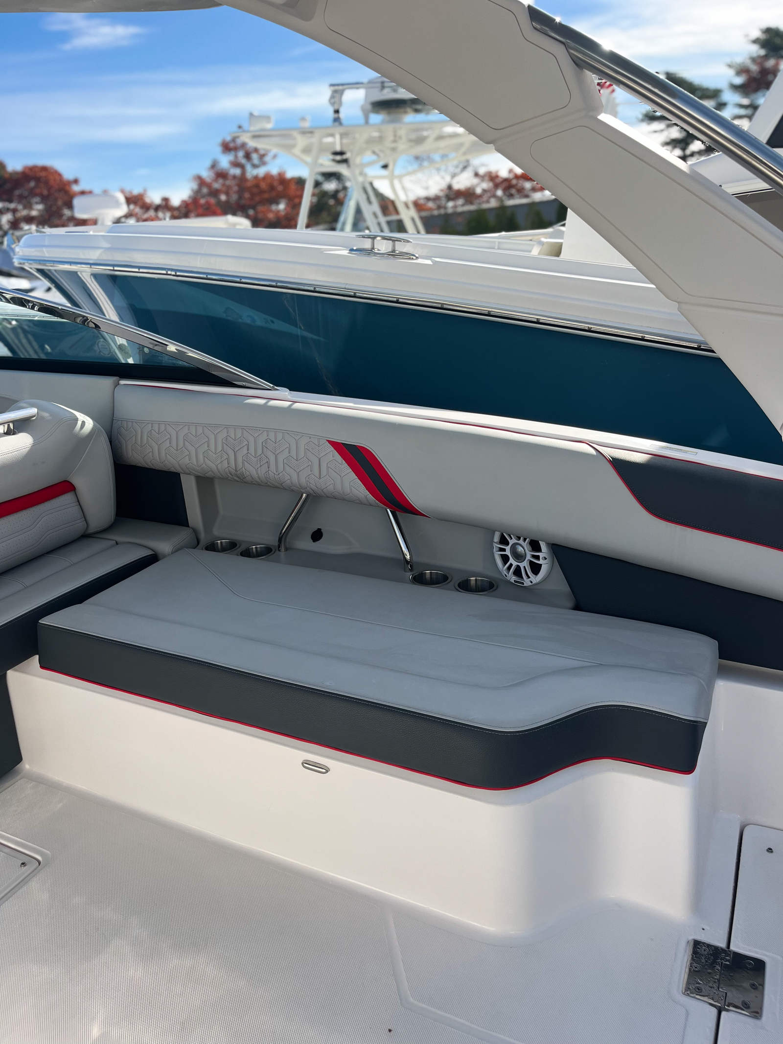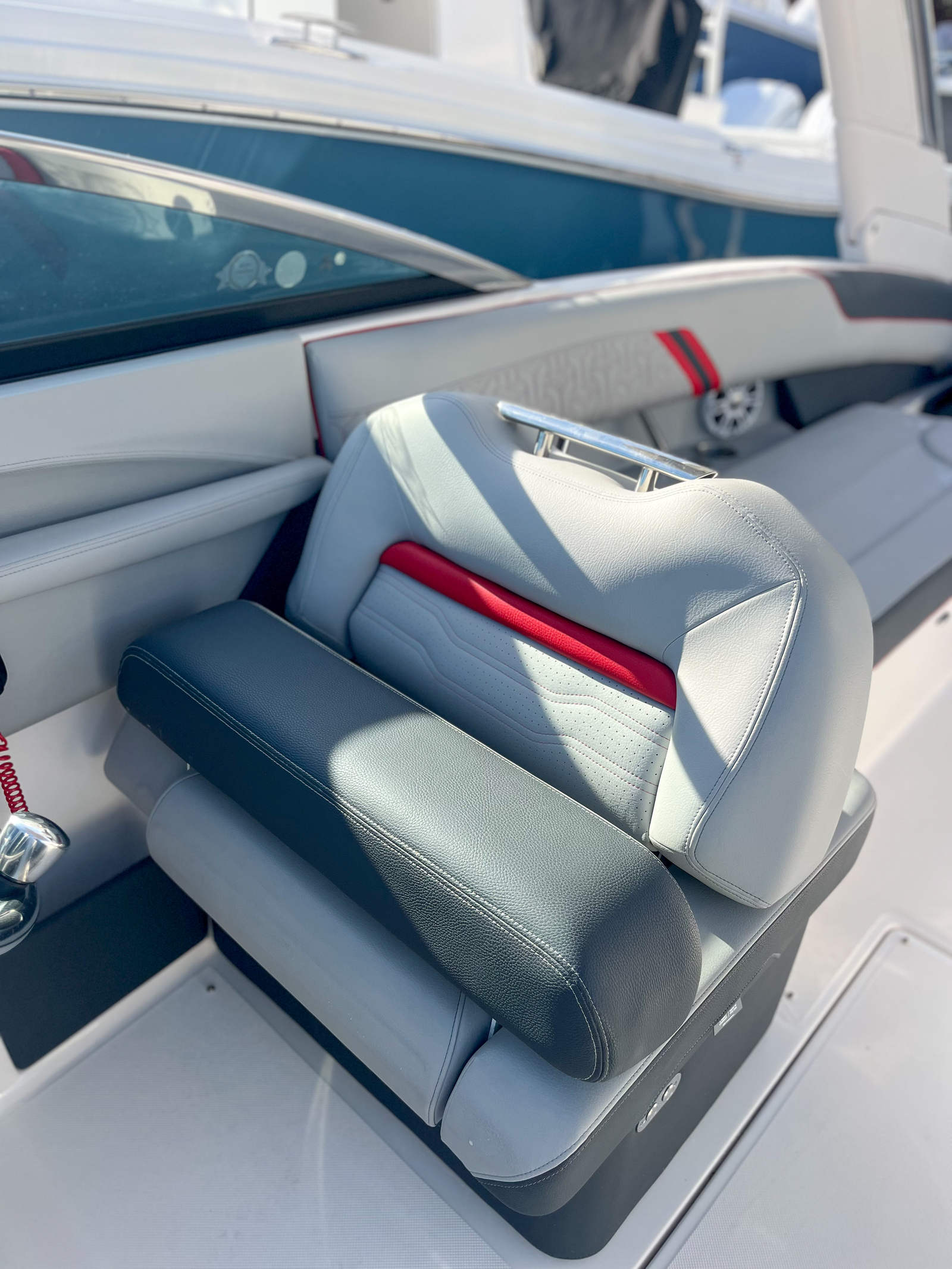 The 2024 Regal LX6 is loaded with premium features that enhance every aspect of your time on the water. The Stereo Performance & Lighting Package transforms the cockpit into an entertainment hub, delivering crisp, immersive sound and vibrant lighting effects for unforgettable onboard parties. Bow & Cockpit Covers provide essential protection from the elements, keeping your boat looking pristine and ready for adventure.For those who love water sports, the Water Sport Tow Pylon is a game-changer, making it easy to tow skiers, wakeboarders, or tubers with confidence. The Dual Battery Switch with Tray and Cables ensures reliable power management, so you can enjoy all your electronics and amenities without worry.The LX6’s interior is a showcase of style and comfort, featuring Flame Red - Simtex and Graphite - Standard upholstery for a bold, contemporary look. The Port Light - Half Moon adds a touch of elegance and natural light to the cabin, while the Cockpit Seagrass Mat provides a soft, non-slip surface underfoot. Underwater Lighting - RGBW creates a mesmerizing ambiance for evening cruises, and the Lunar Grey - Standard accents complete the sophisticated aesthetic.