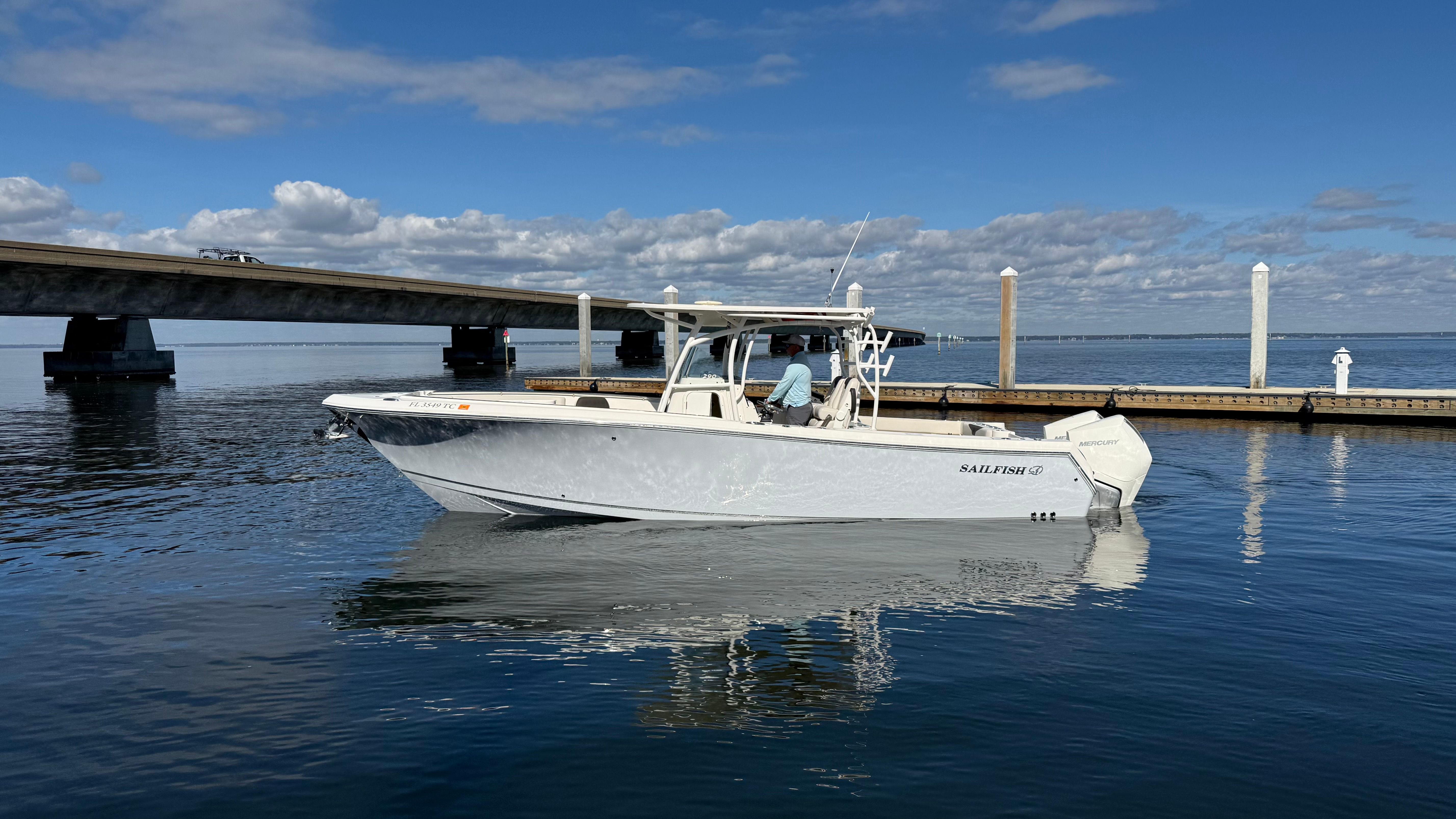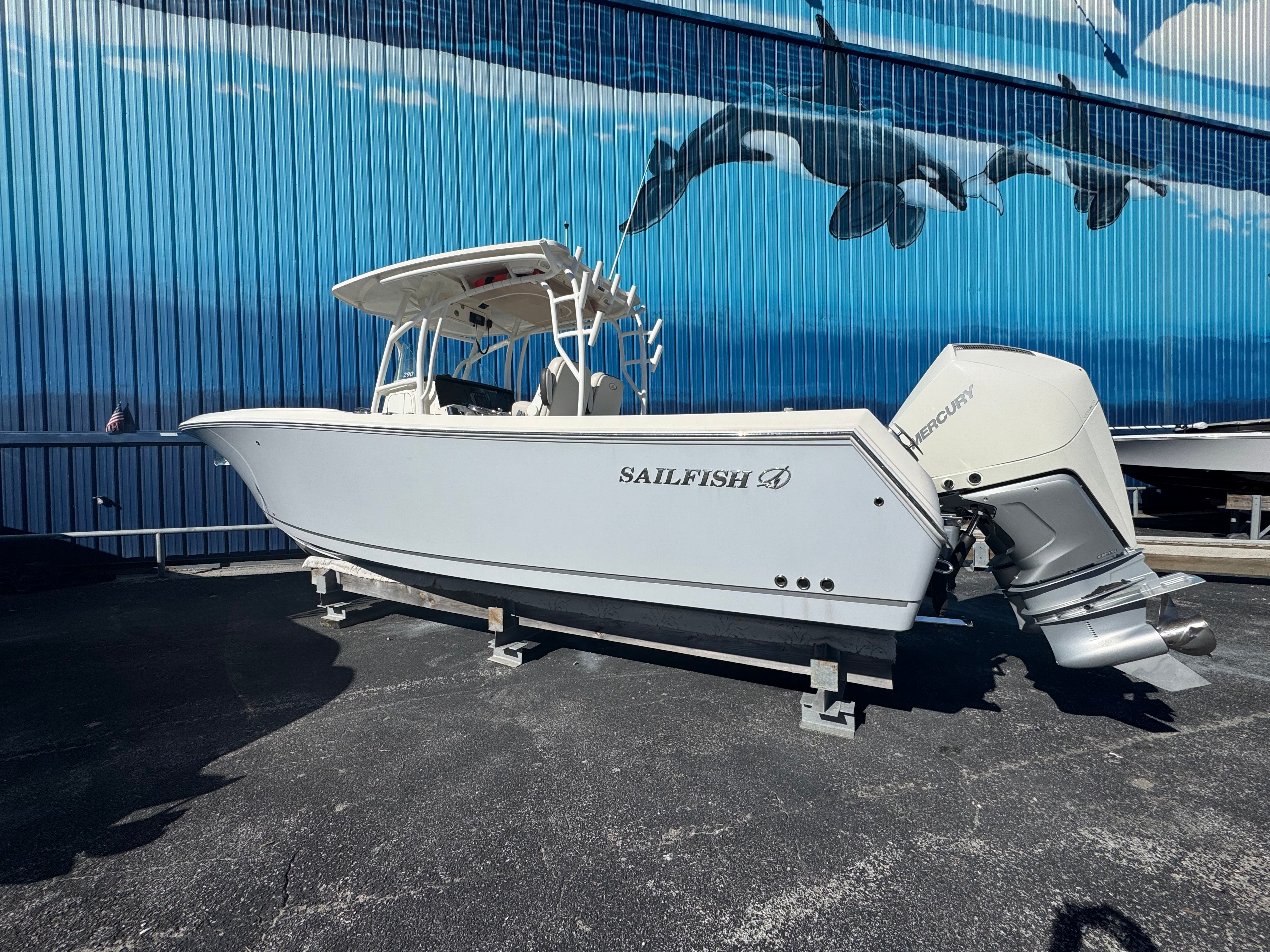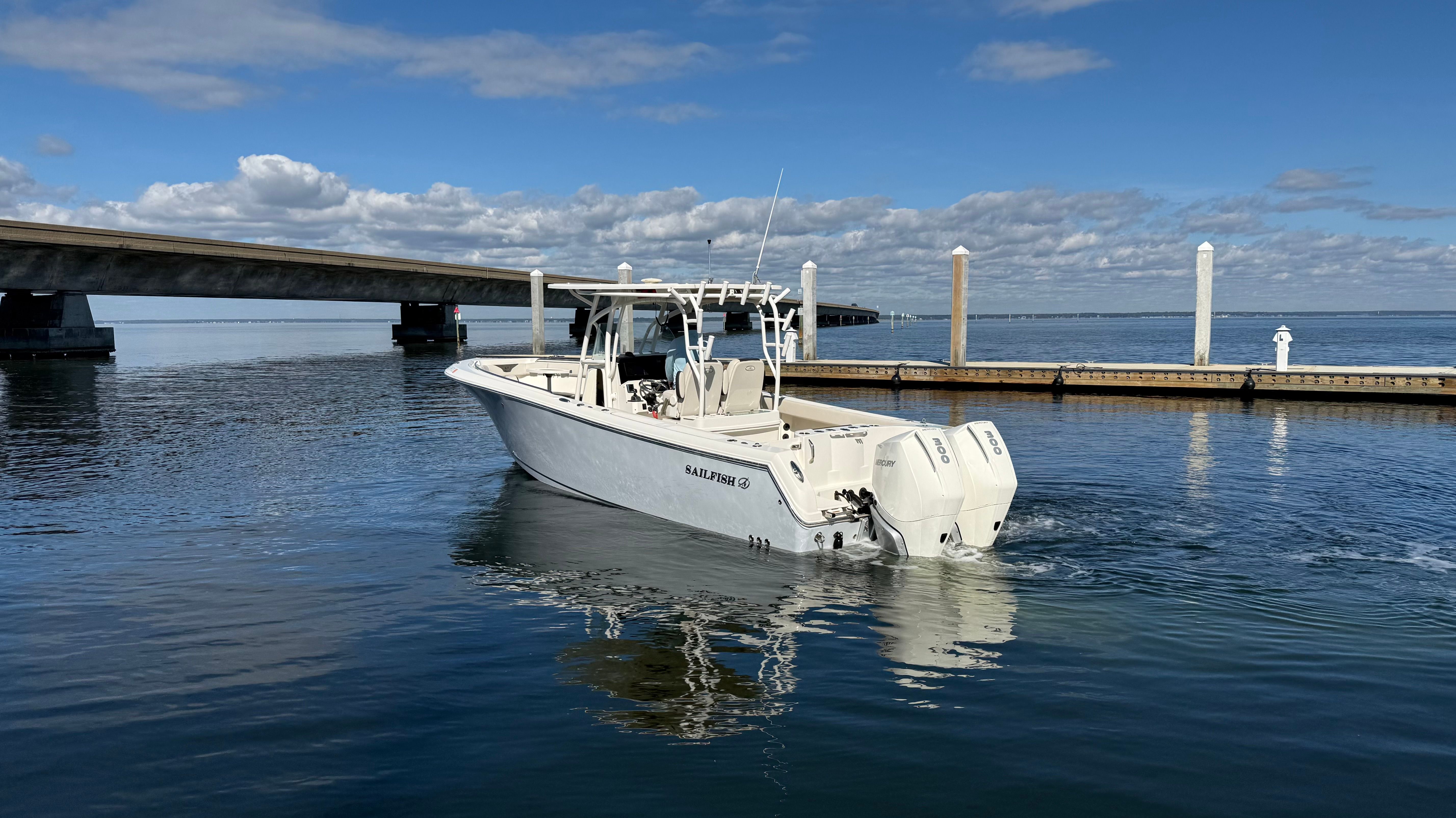One owner beautiful Sailfish 290CC with only 105 hrs on her Twin white Mercury Verado 300's! Engines have 5 yr extended warranty, 100hr service just performed, this one is truly turnkey and ready to go.