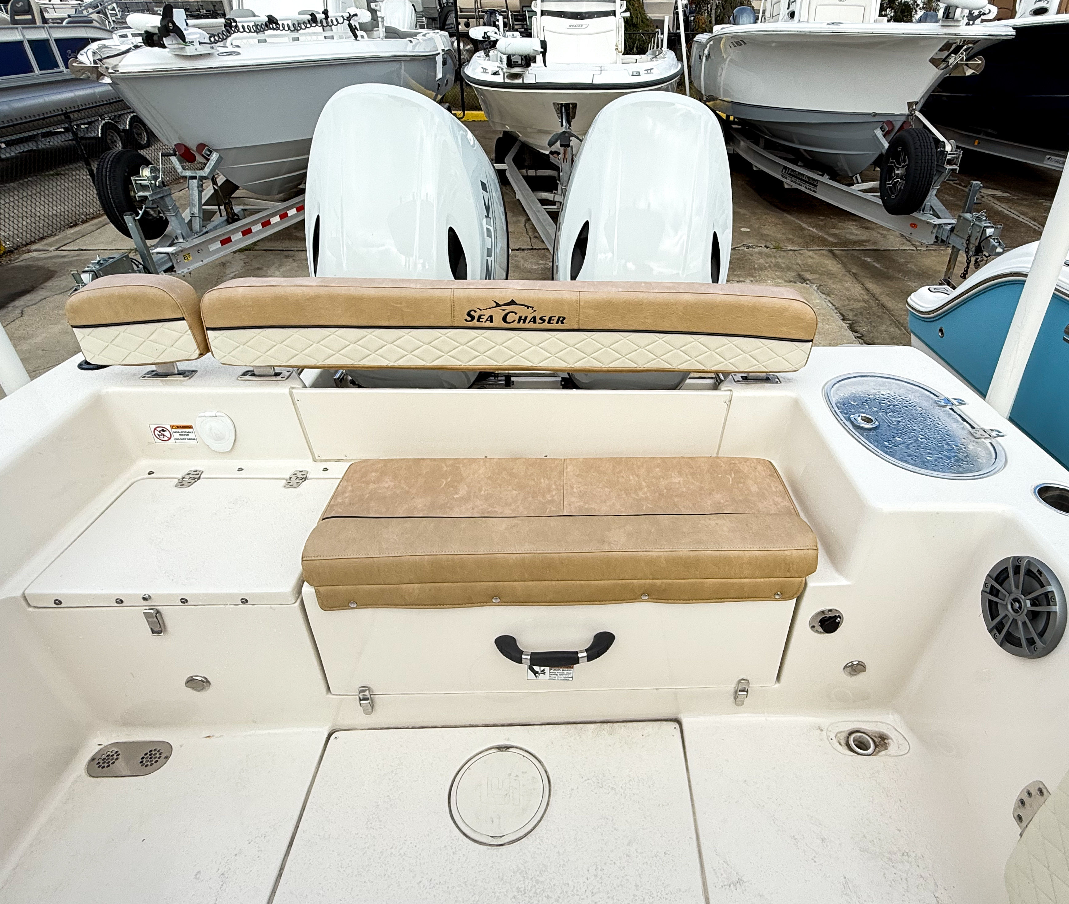Practicality is at the heart of the Sea Chaser 24 HFC’s design. The boat’s manageable length makes it easy to dock, trailer, and store, reducing the hassle of ownership and allowing you to spend more time on the water. The efficient dual-engine setup not only delivers impressive power but also helps optimize fuel consumption, making your adventures more economical.Storage is another strong point of the Sea Chaser 24 HFC. The well-thought-out layout provides plenty of space for stowing gear, tackle, and personal items, keeping the deck clutter-free and organized. The center console configuration also makes it easy to access all areas of the boat, whether you are preparing for a fishing trip or setting up for a day of water sports.