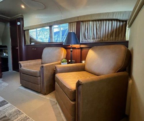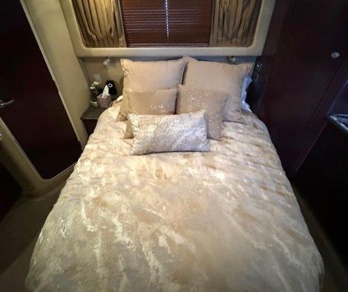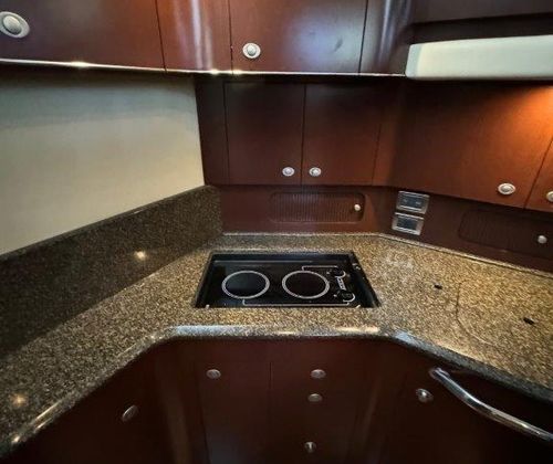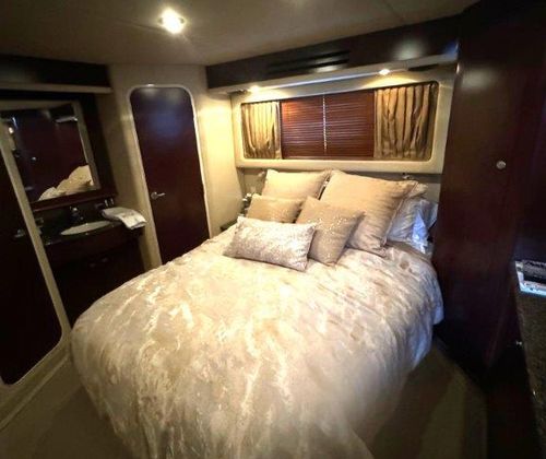 The salon is bright and open, perfect for entertaining, with a fully equipped galley that will please any onboard chef. Head up to the fully enclosed bridge, where A/C and heating let you cruise in comfort year-round — all while enjoying panoramic 360° views.