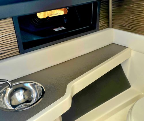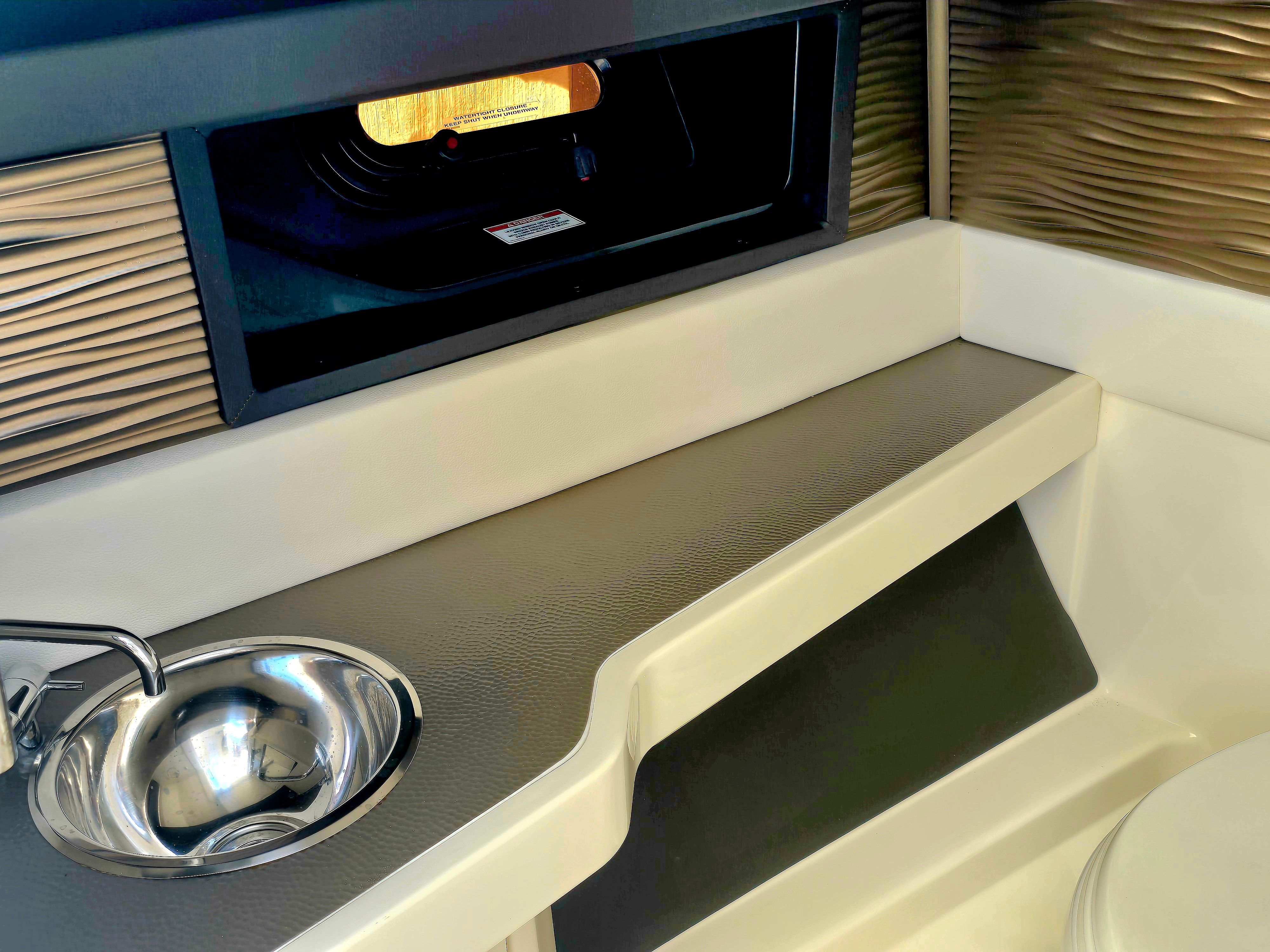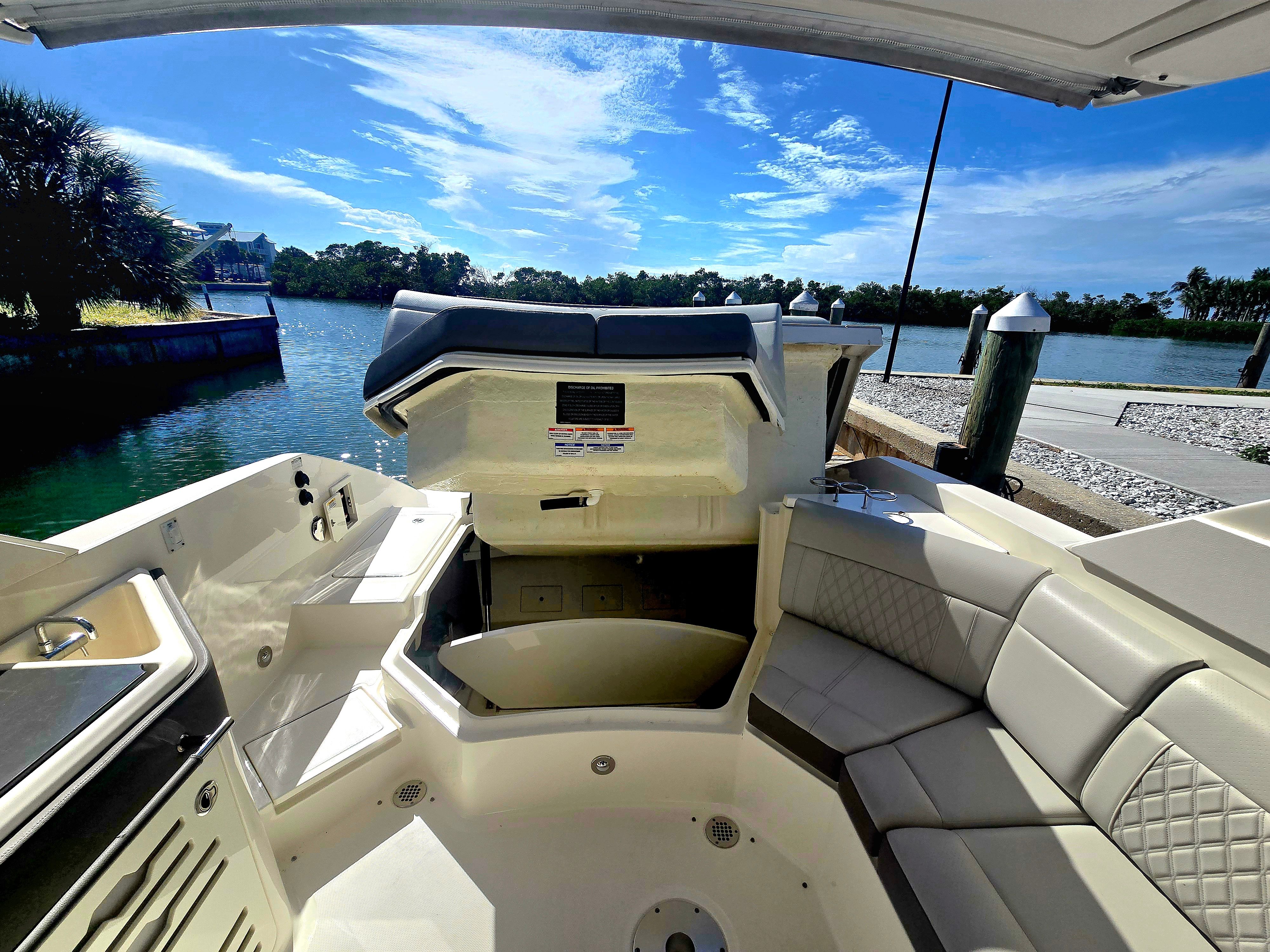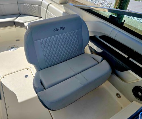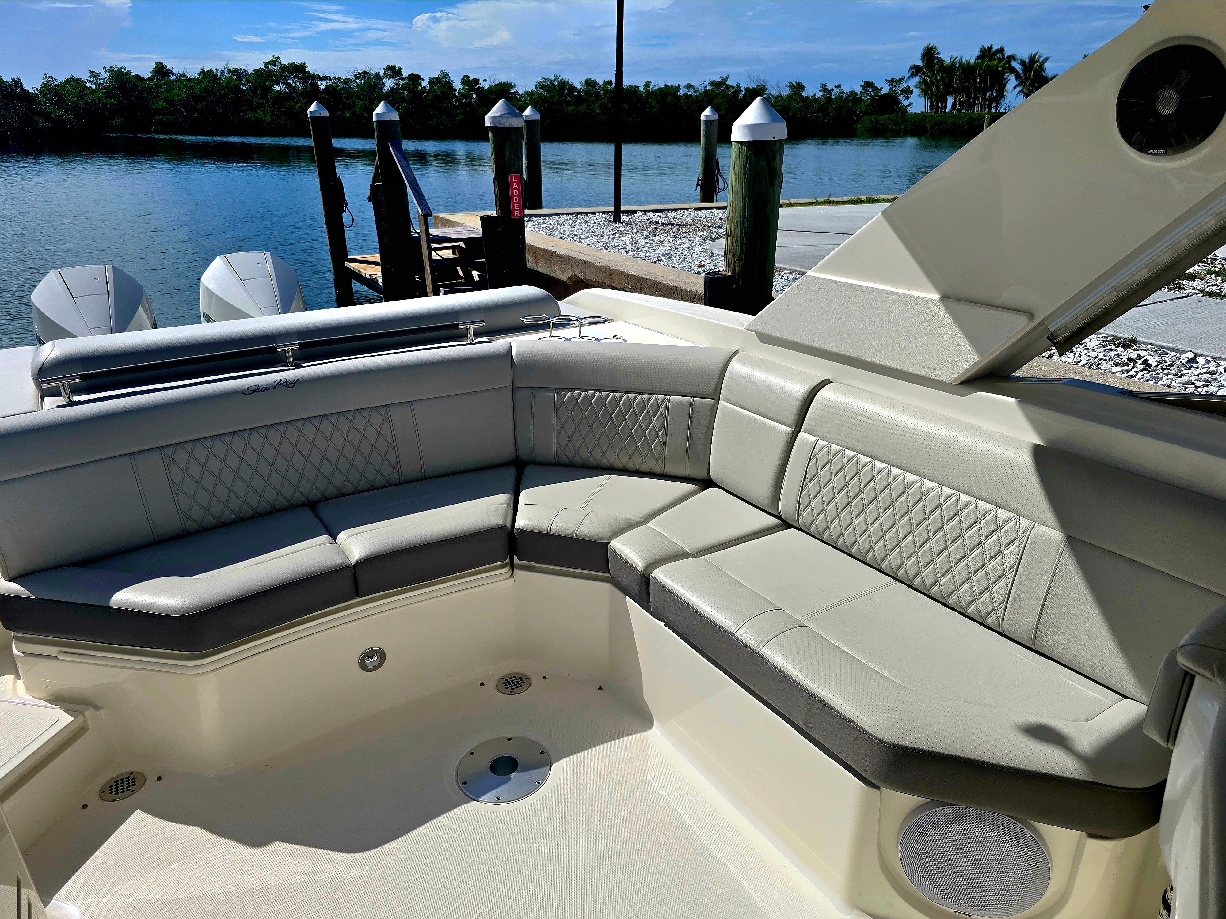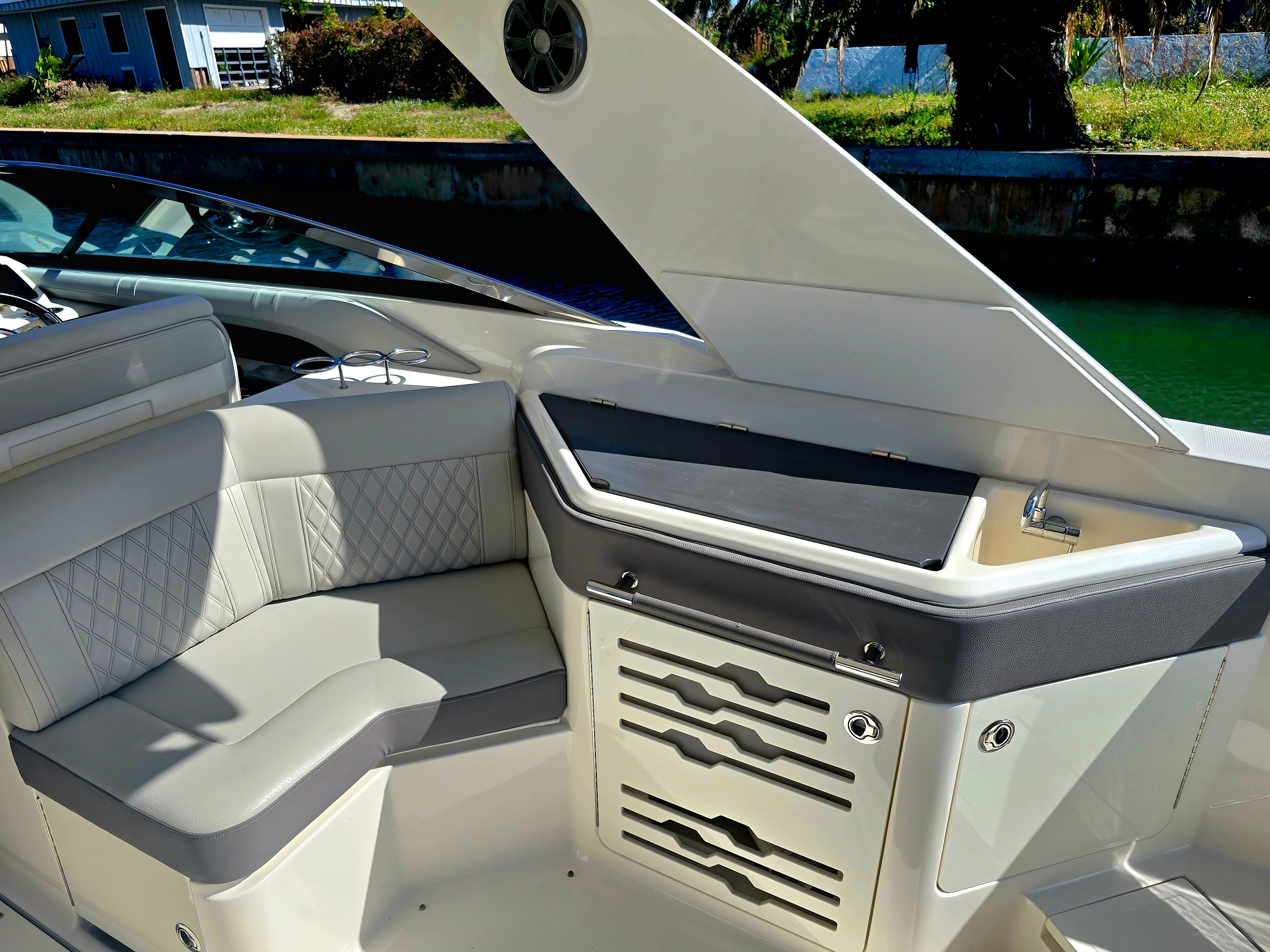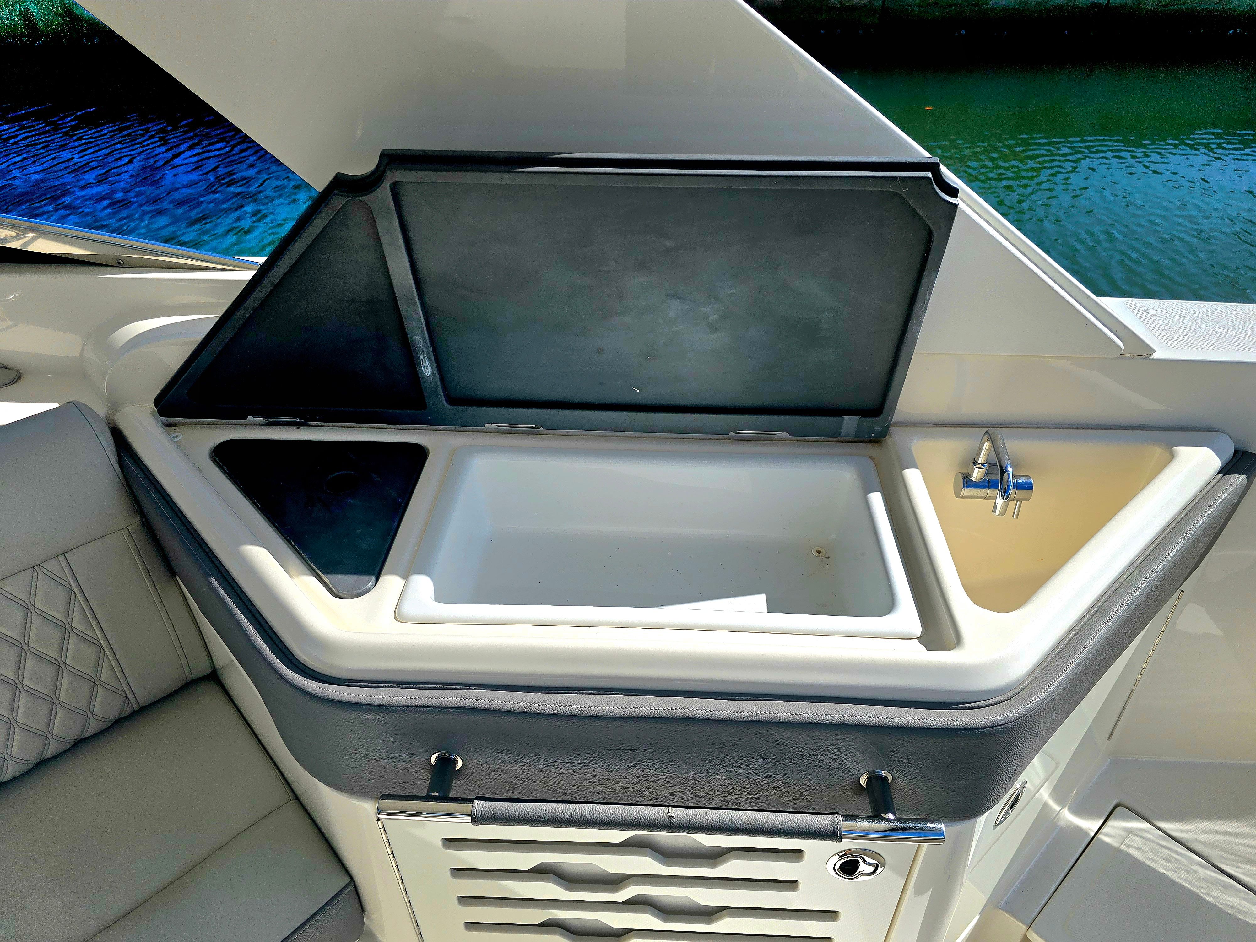 The Sea Ray SLX 310 is designed with practicality in mind, making ownership both enjoyable and convenient. The ample storage space allows you to bring along all your gear, from water toys to picnic supplies, without feeling cramped or cluttered. The boat’s manageable size and responsive handling make docking and maneuvering a breeze, even in tight spaces.Fuel efficiency is another key benefit, thanks to the advanced engineering of the twin engines. You can spend more time on the water and less time at the fuel dock, maximizing your boating adventures. The thoughtful layout and easy access to all areas of the boat make it simple to clean, maintain, and prepare for your next outing.