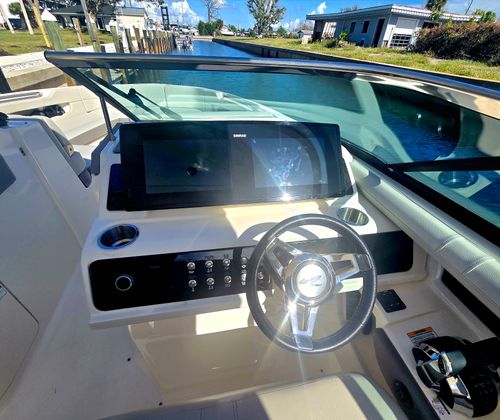 The 2021 Sea Ray SLX 310 is packed with features that enhance both functionality and enjoyment. As a spacious bowrider, it offers generous seating arrangements, allowing everyone on board to relax and soak up the sun. The open bow design is perfect for socializing, sunbathing, or simply enjoying panoramic views of the water. The cockpit area is thoughtfully designed for convenience and comfort, with ergonomic seating and easy access to all controls.This Sea Ray boat for sale is engineered with quality materials and attention to detail, ensuring durability and a premium feel throughout. The twin engines not only provide impressive horsepower but also contribute to the boat’s overall balance and stability. The 31-foot length offers plenty of room for movement, storage, and entertaining, making it an ideal choice for those who value both space and style.