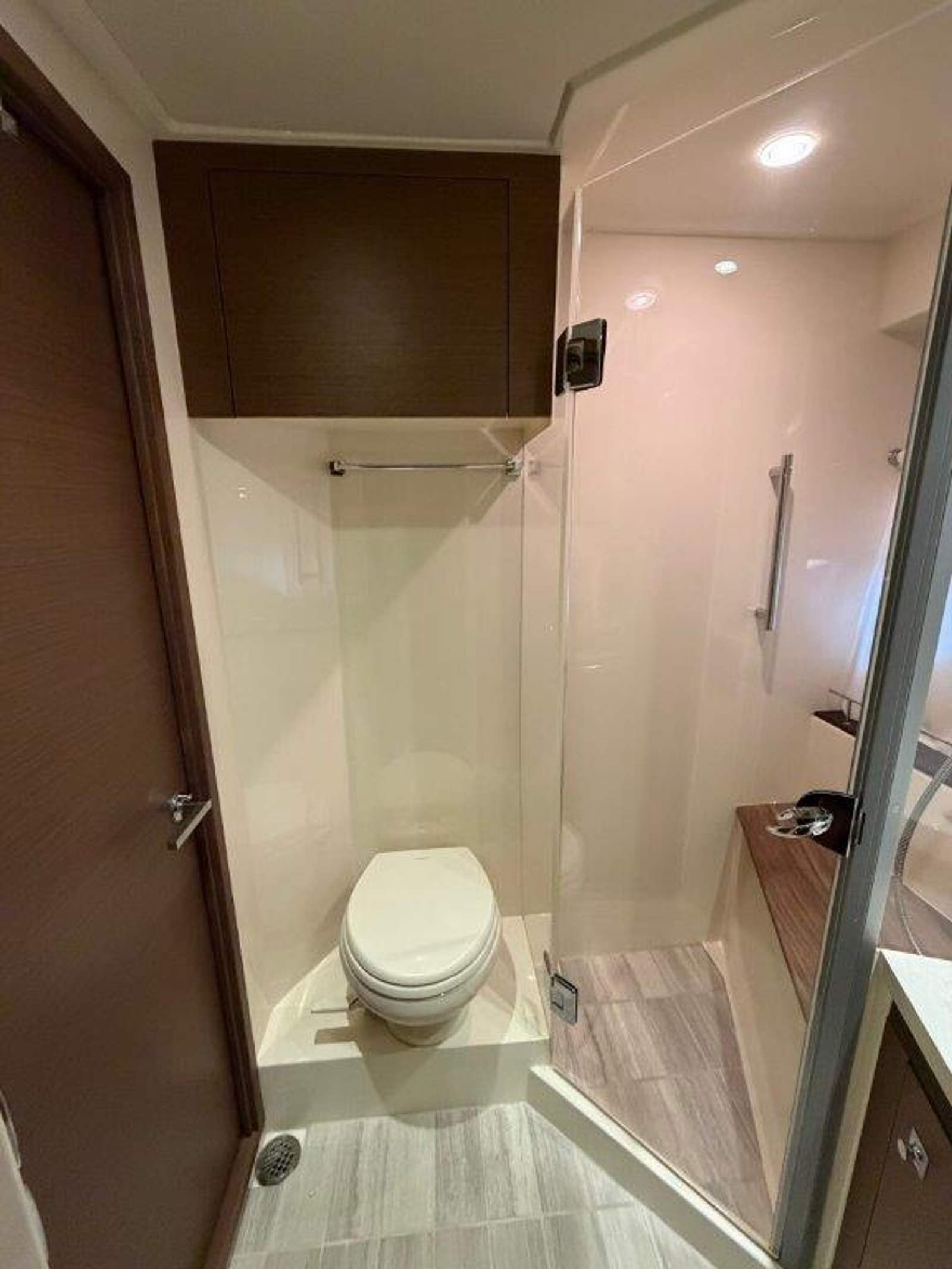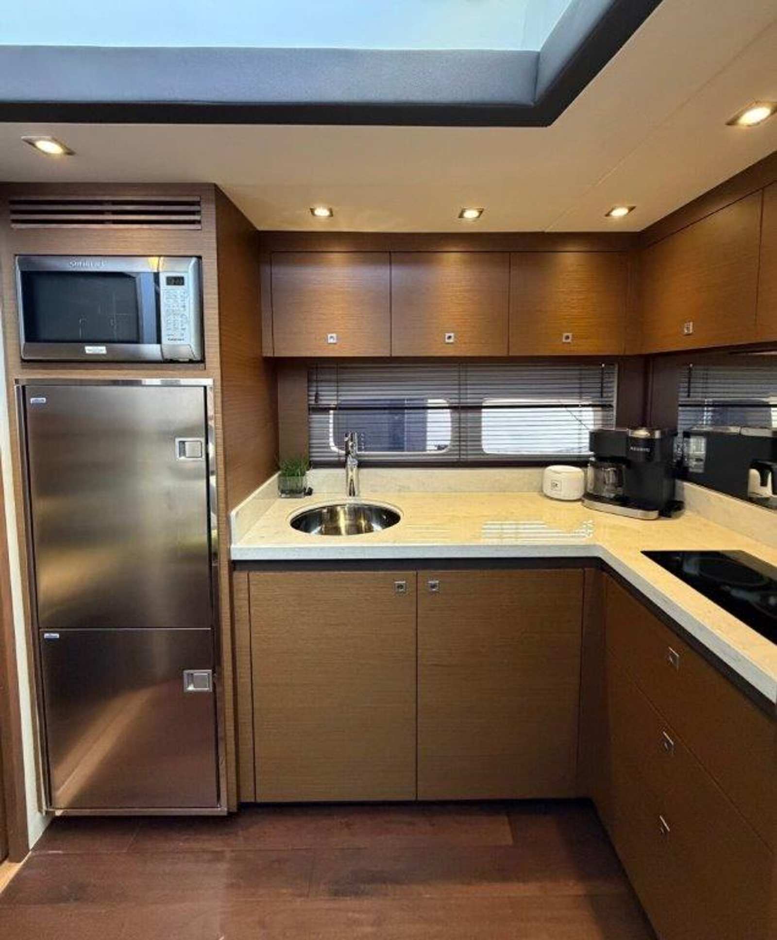 Below deck, the midship master suite is an oasis of comfort, featuring upgraded fabrics and finishes along with separate head and shower compartments. The main cabin boasts a gourmet galley and plush seating in a naturally lit, atrium-style space, making it ideal for gatherings or quiet relaxation.