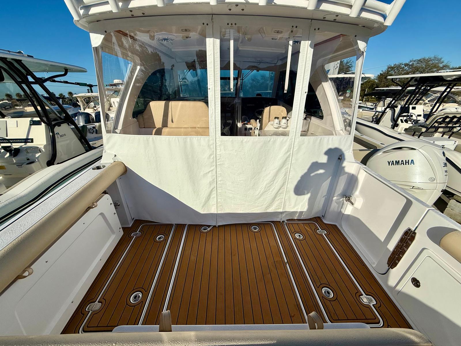At the helm, you’ll find twin Garmin 16-inch navigation displays with integrated sonar, offering crystal-clear charts, fishfinding capability, and full system integration. A Garmin radar system enhances visibility and safety when running offshore or navigating in limited visibility, and the onboard autopilot allows for stress-free cruising on longer runs. Entertainment is handled by a premium Fusion stereo system with bow-to-stern speakers, delivering rich, balanced sound whether you’re entertaining at anchor or underway.