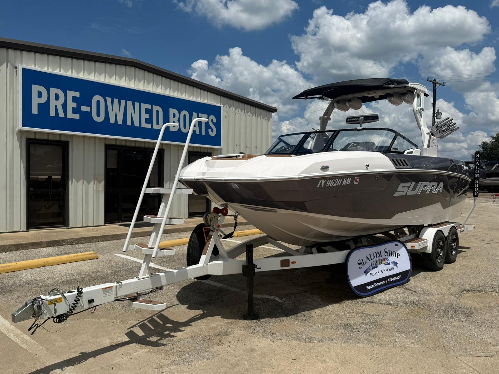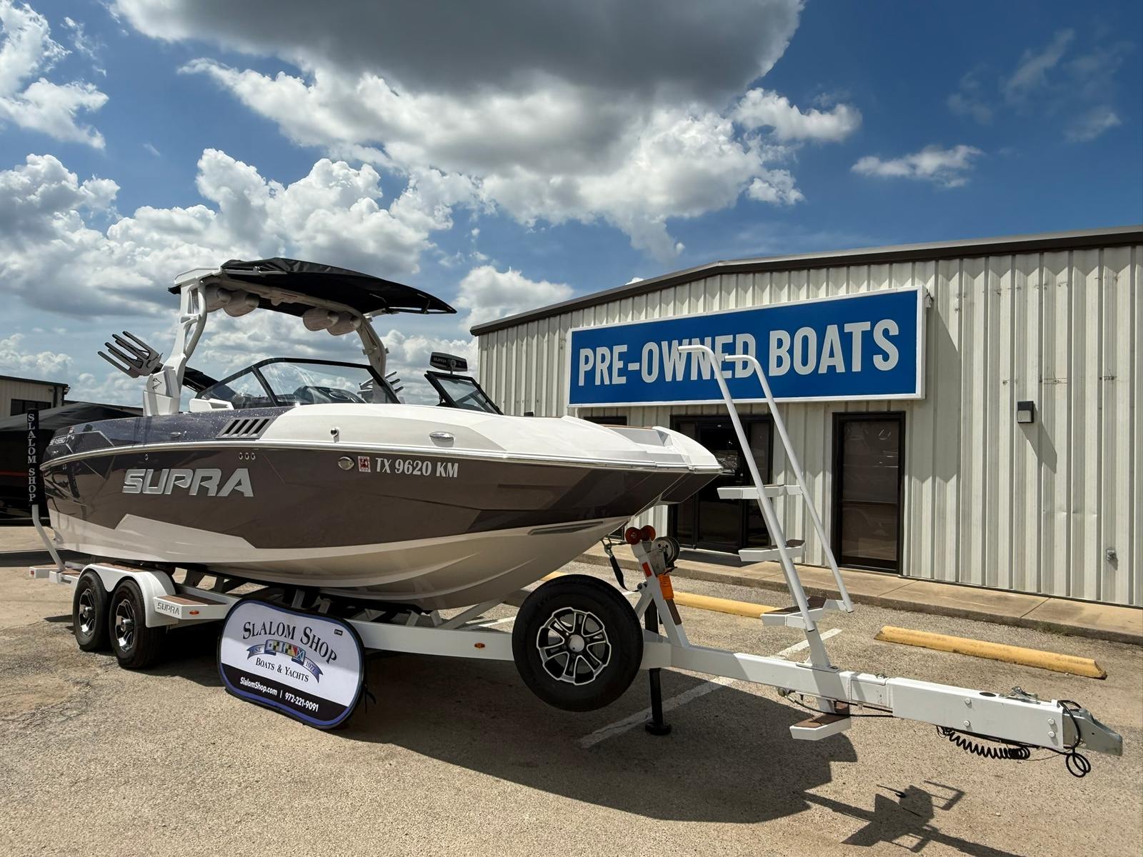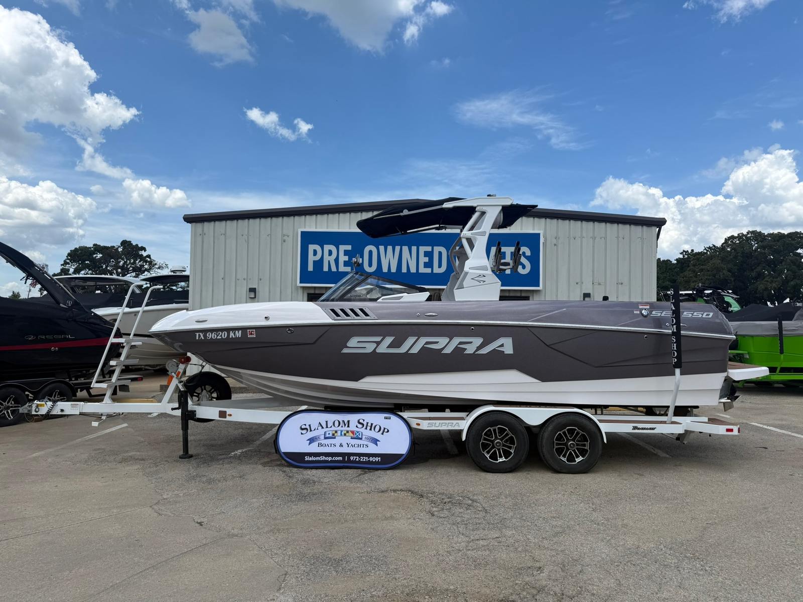 Now available on consignment at our New Used Boat Super Center in Lewisville, Turn heads and dominate the water with this 2022 Supra SE 550, finished in stunning Gunmetal Flake & White Gelcoat. This top-of-the-line wake and surf machine is powered by a Supercharged Indmar 6.2L Raptor V8 (550 HP) and shows just 148 hours of run time. With every premium feature Supra has to offer—including dual stern thrusters, SWELL Surf System, and AutoWake—this boat is built to deliver next-level performance and luxury.