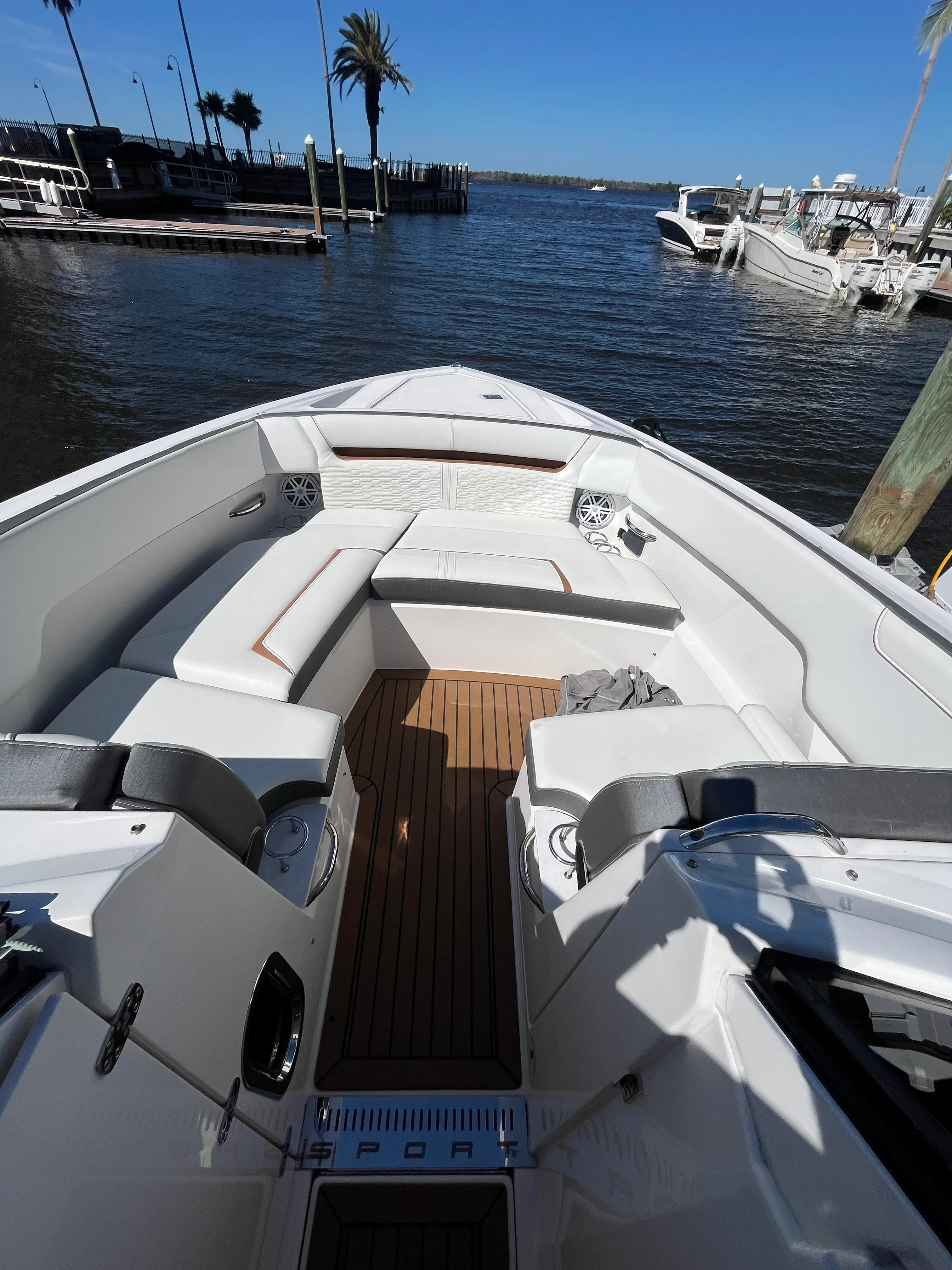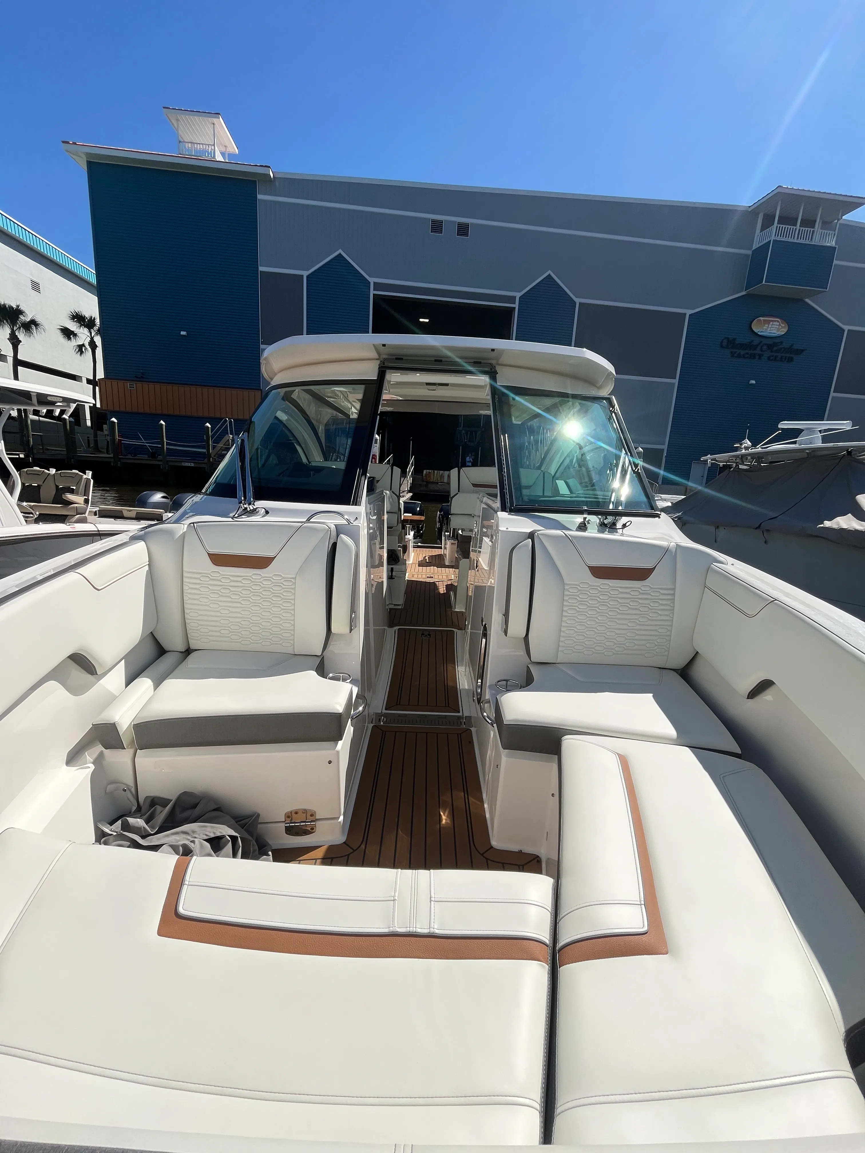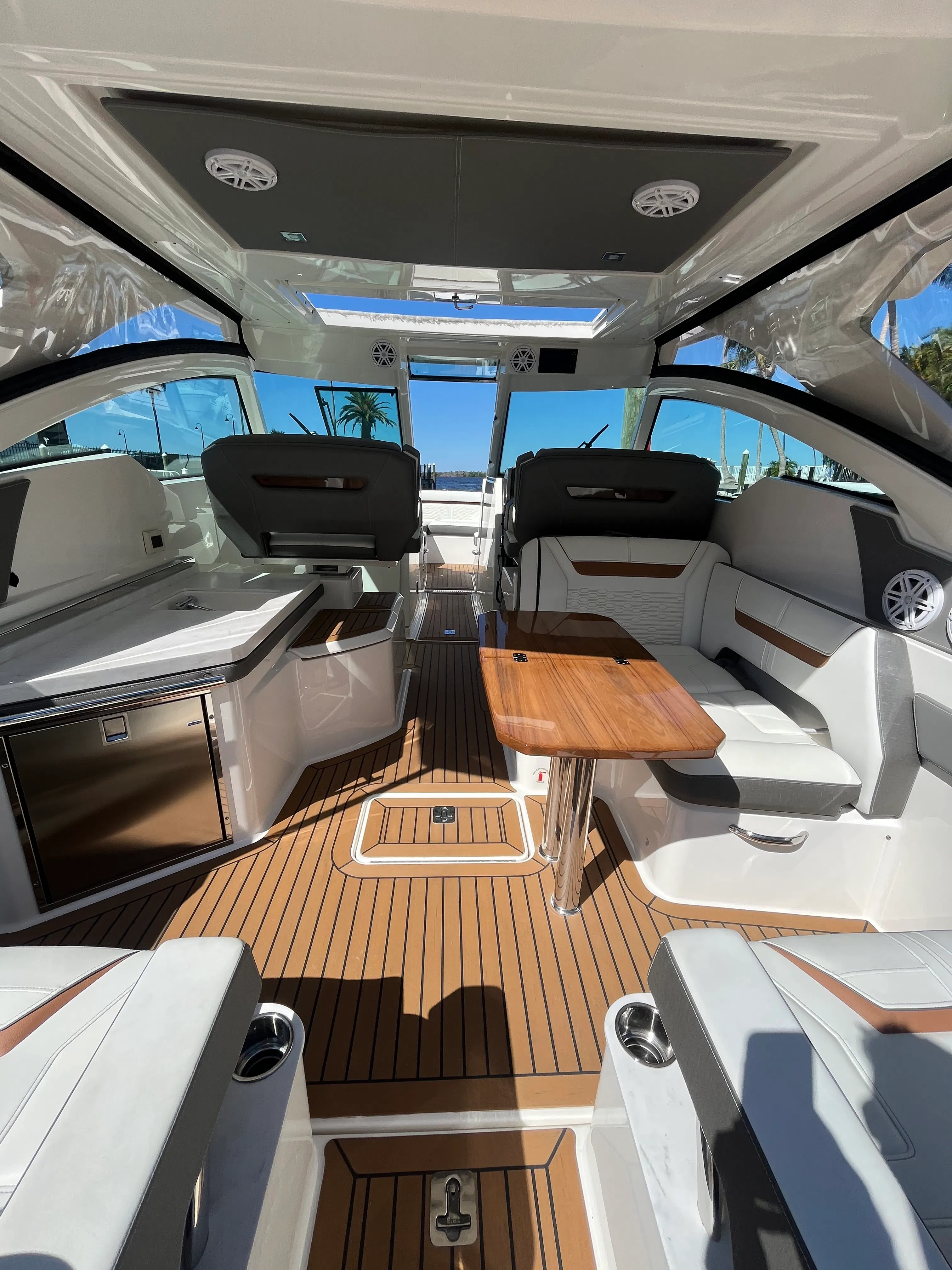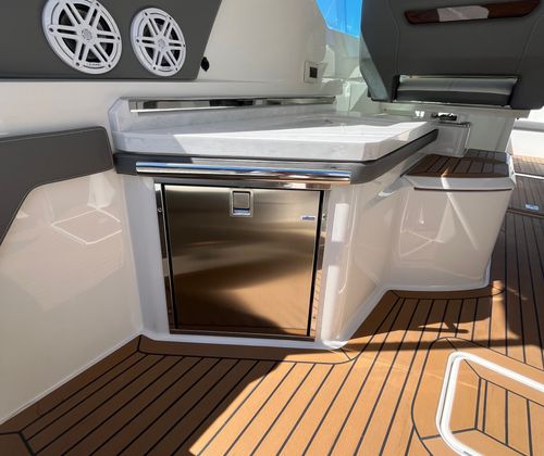 The Tiara Yachts 34 LX is packed with features that elevate your boating experience. Its spacious deck layout is designed for both relaxation and entertainment, with ample seating and open areas for socializing. The yacht’s premium materials and finishes reflect Tiara Yachts’ commitment to quality, ensuring durability and a luxurious feel throughout. The 34.75-foot length provides generous space for guests, while the thoughtful design maximizes comfort and convenience. Whether you are hosting a sunset cocktail party or enjoying a quiet afternoon on the water, this yacht boat for sale delivers the perfect setting.