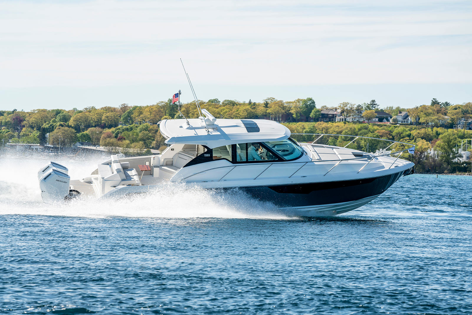 Power and precision define the performance of the Tiara Yachts 43 LE. Equipped with twin Mercury® 600 V12 Verado® outboard engines, this yacht delivers a combined 1800 horsepower, ensuring exhilarating speed and smooth handling in a variety of conditions. The Mercury® Integrated Bow Thruster System enhances maneuverability, making docking and tight turns effortless, even for less experienced captains. Whether you’re cruising along the coastline or venturing into open waters, the 43 LE offers a responsive and thrilling ride that sets it apart from other yacht boats for sale.