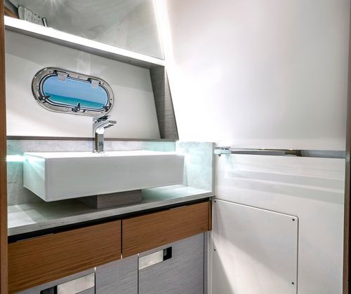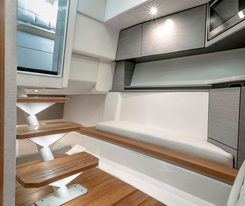 Practicality is at the heart of the Tiara Yachts 43 LS. The oil changer and Electrosea Strainer make routine maintenance straightforward, saving you time and effort. The macerator ensures efficient waste management, while the Syn Teak Deck provides a non-slip surface that’s easy to clean and maintain. The swim/step area is perfect for boarding, swimming, or docking, adding convenience to every trip.Storage solutions are thoughtfully integrated throughout the yacht, allowing you to stow gear, supplies, and personal items securely. The intuitive joystick piloting system simplifies docking and maneuvering, making it easy to handle the yacht in tight spaces. Fuel efficiency is enhanced by the advanced Mercury V12 engines, so you can enjoy longer journeys without frequent stops.