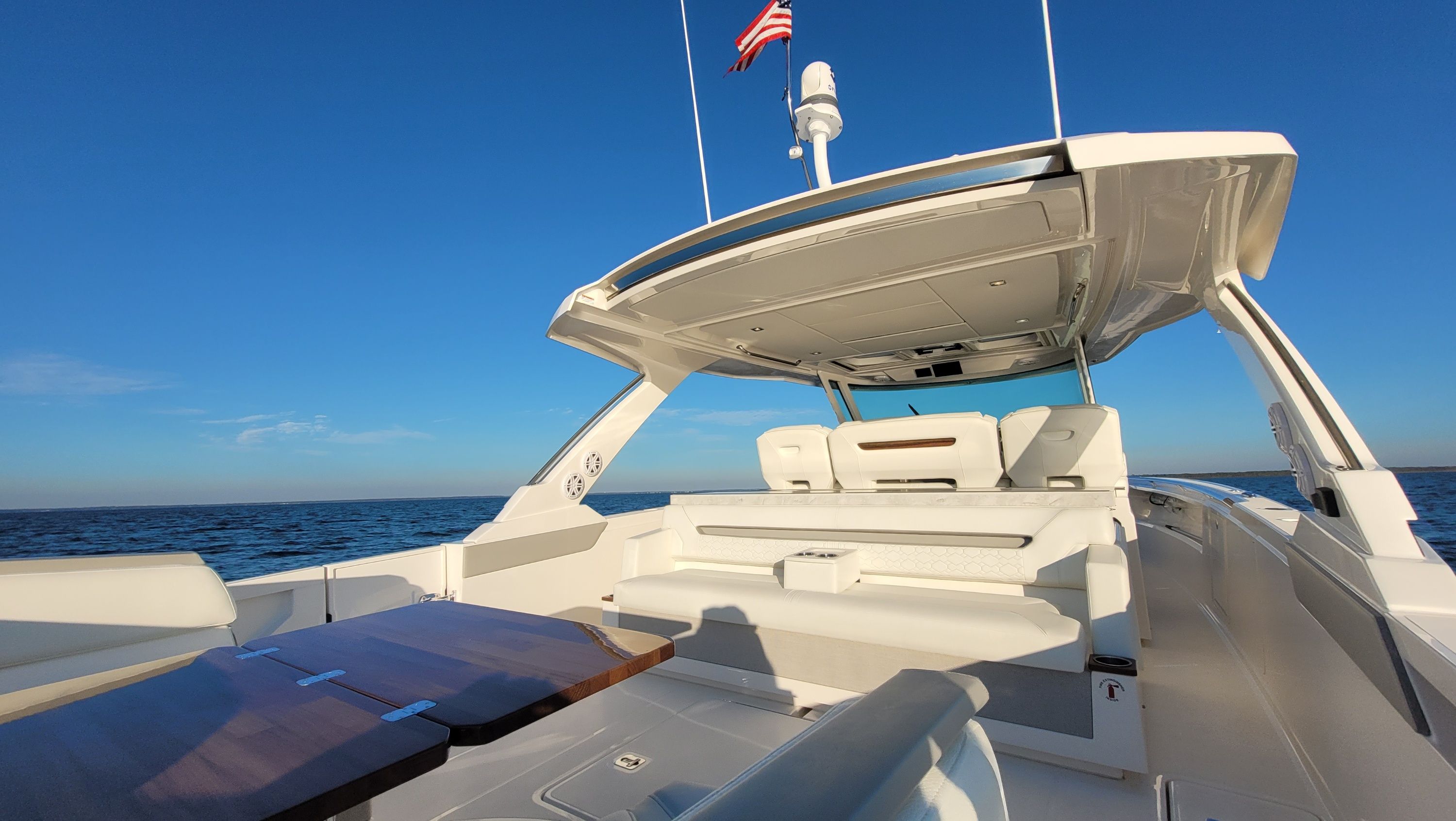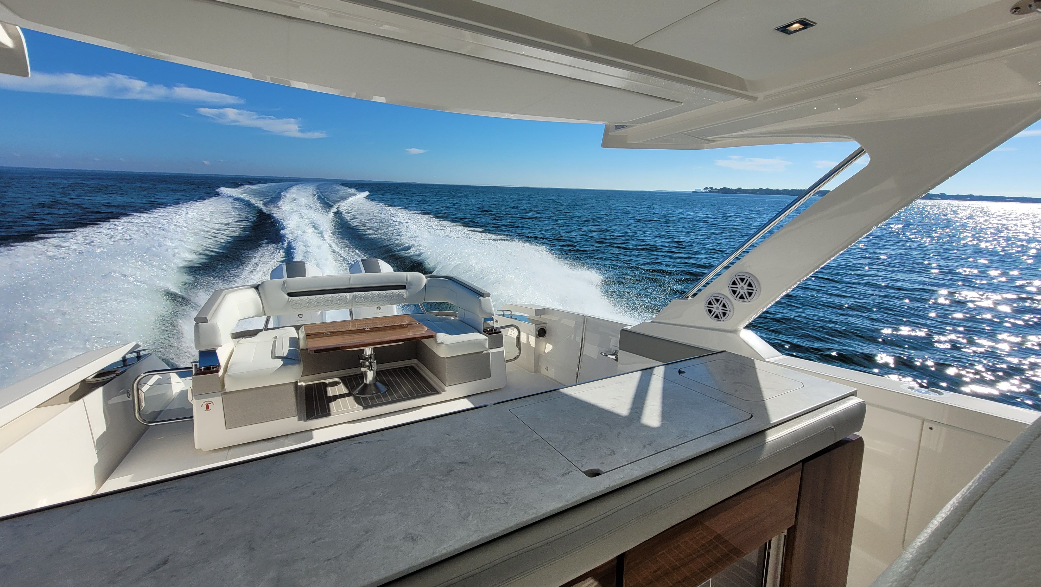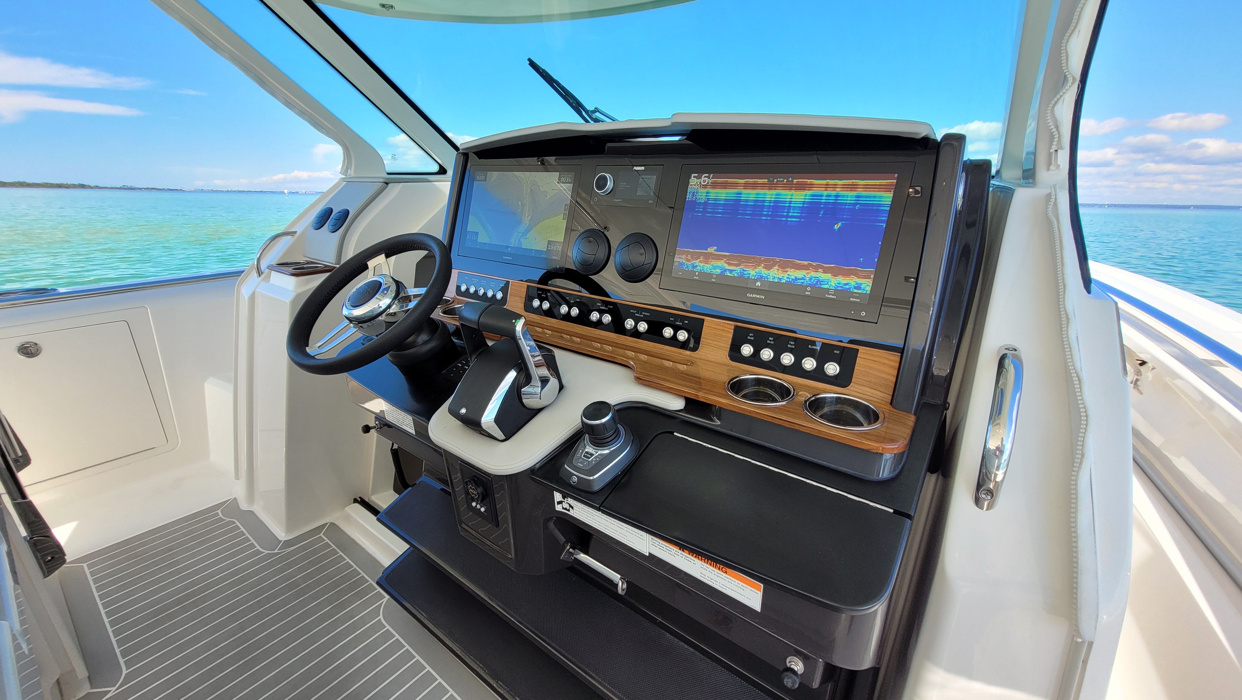 sunshade flows seamlessly to the superb helm area with center helm flanked by comfortable seats to both port and