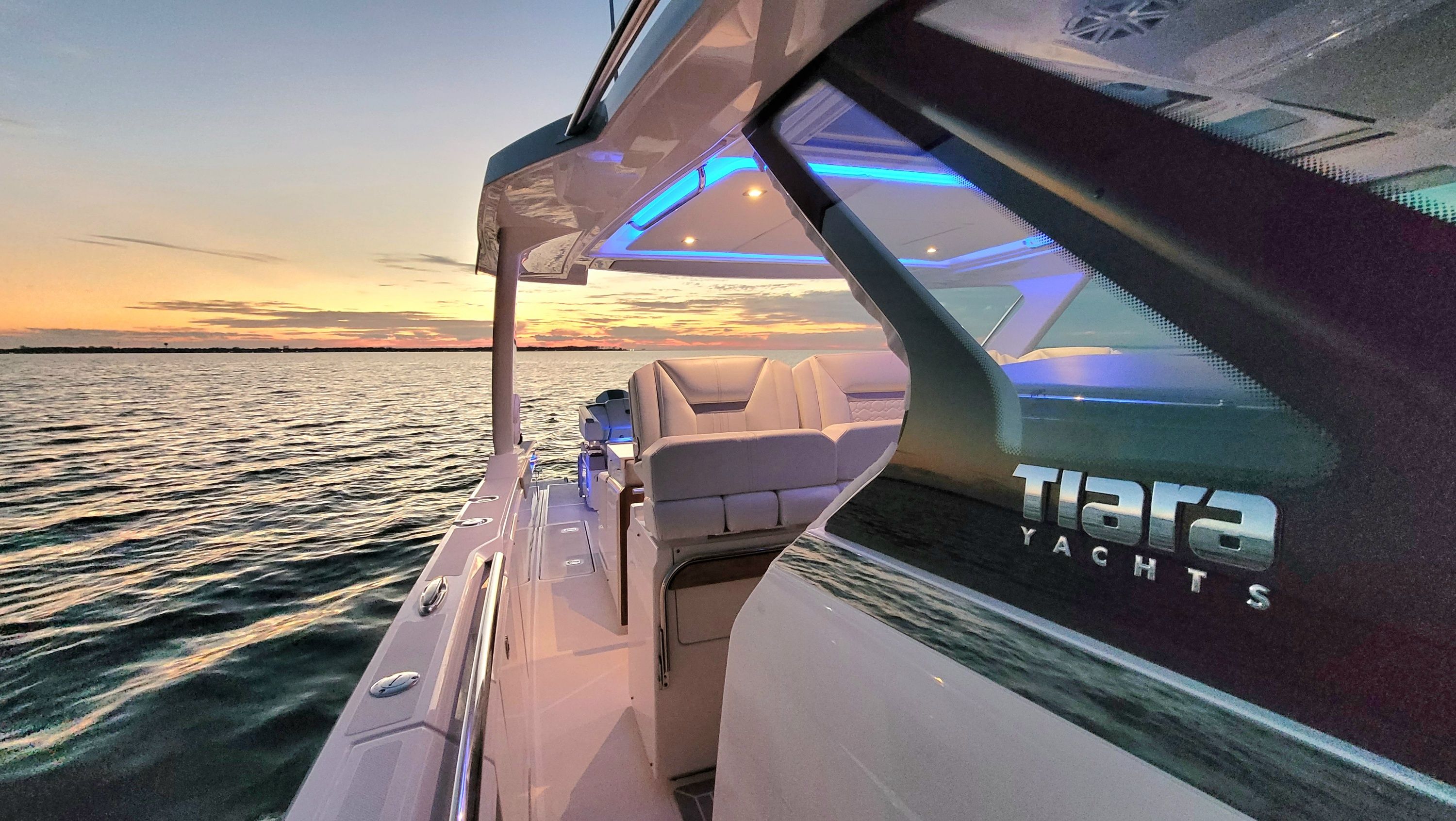 2023 Tiara 43LS, very low hours, finished in stunning Silver Crystal Metallic with Carbon bootstripe and powered