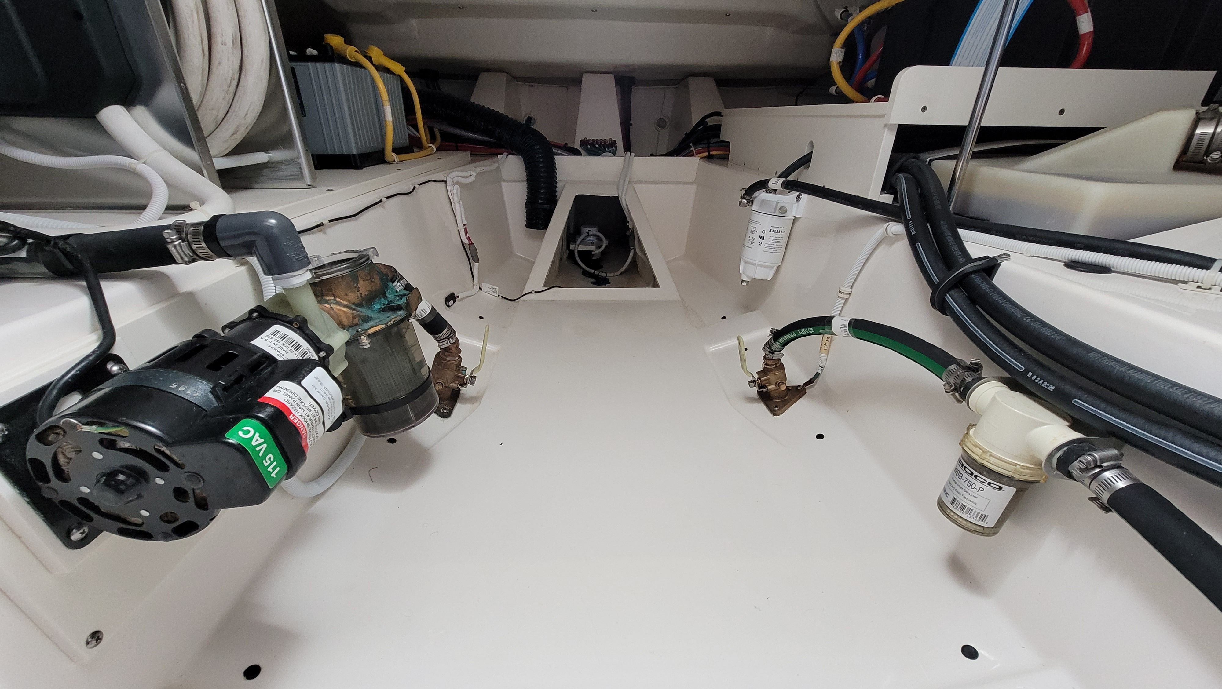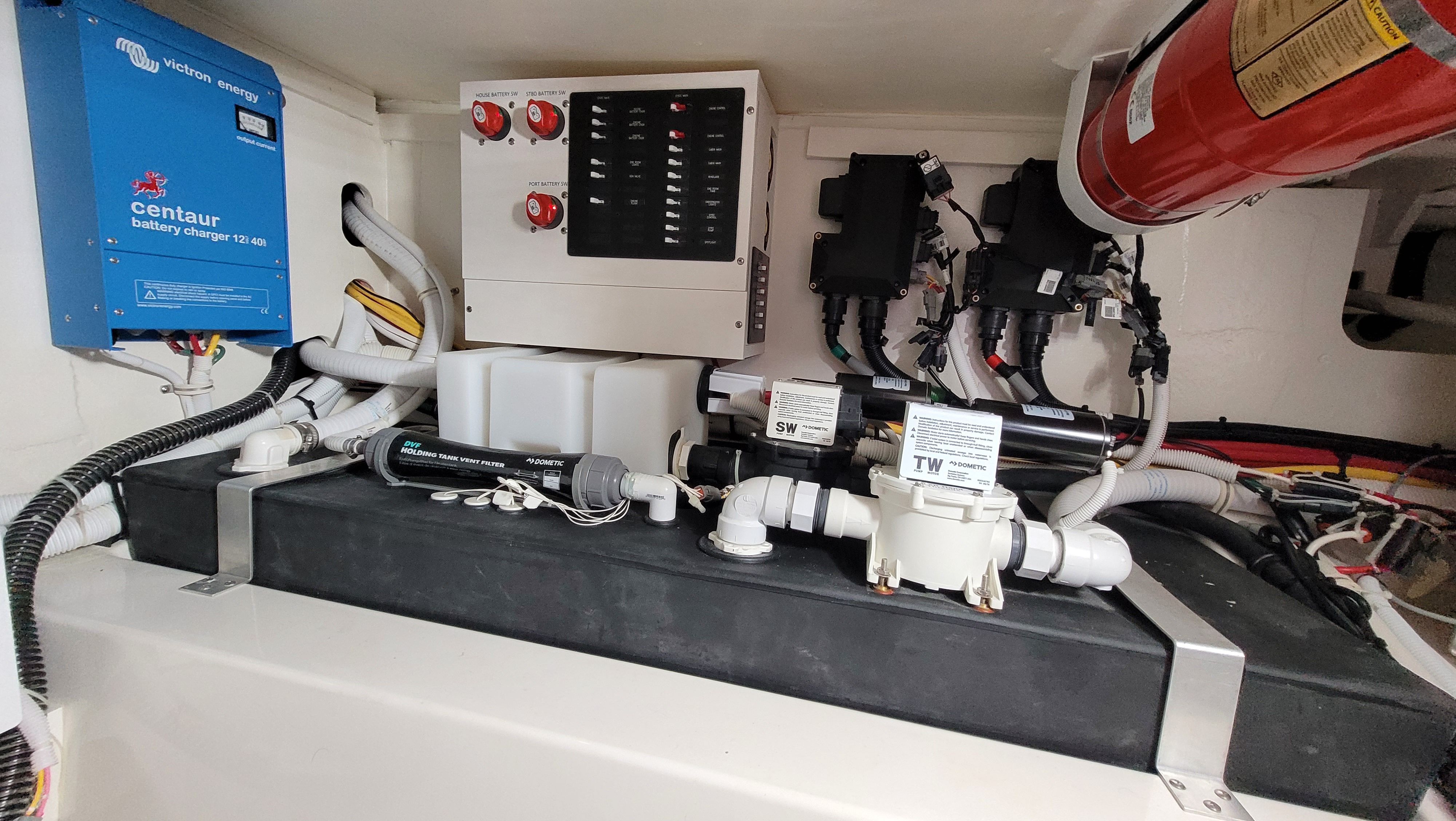 Weather, three piece enclosure with side curtain, head macerator system, Lenco electric trim tabs with auto retract