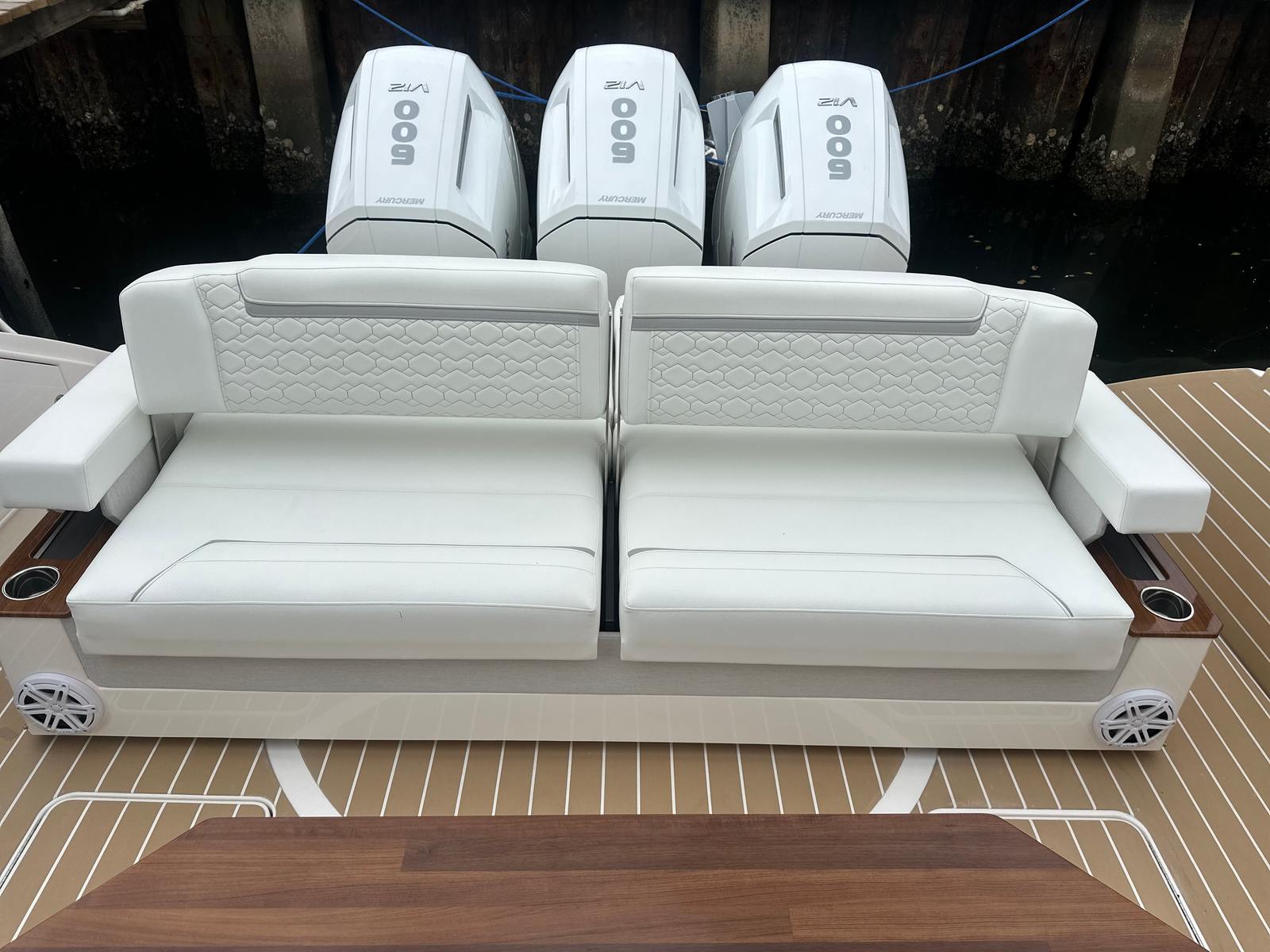 The Tiara Yachts 48 LS is packed with special features that enhance both functionality and enjoyment. The triple Mercury V12 600HP JPO engines not only deliver impressive power but also offer advanced control for precise handling. The bow thruster, integrated with Mercury JPO, adds another layer of convenience, making tight maneuvers simple and stress-free. For those who love to keep their vessel clean and ready for action, the raw water washdown systems in both the cockpit and anchor locker provide easy maintenance. The oil changer for the generator streamlines routine upkeep, allowing you to spend more time enjoying your yacht.Comfort and leisure are elevated with the lounge module, offering a plush space to relax and socialize. Fishing enthusiasts will appreciate the rod holders in the gunnels, making it easy to gear up for a day on the water. The macerator waste system ensures efficient and hygienic waste management, while the SYN Teak Deck - STD PKG - Natural provides a beautiful, durable surface that’s both stylish and practical. Every detail of the 48 LS is designed to enhance your boating experience, from the spacious deck layout to the thoughtful storage solutions throughout the vessel.