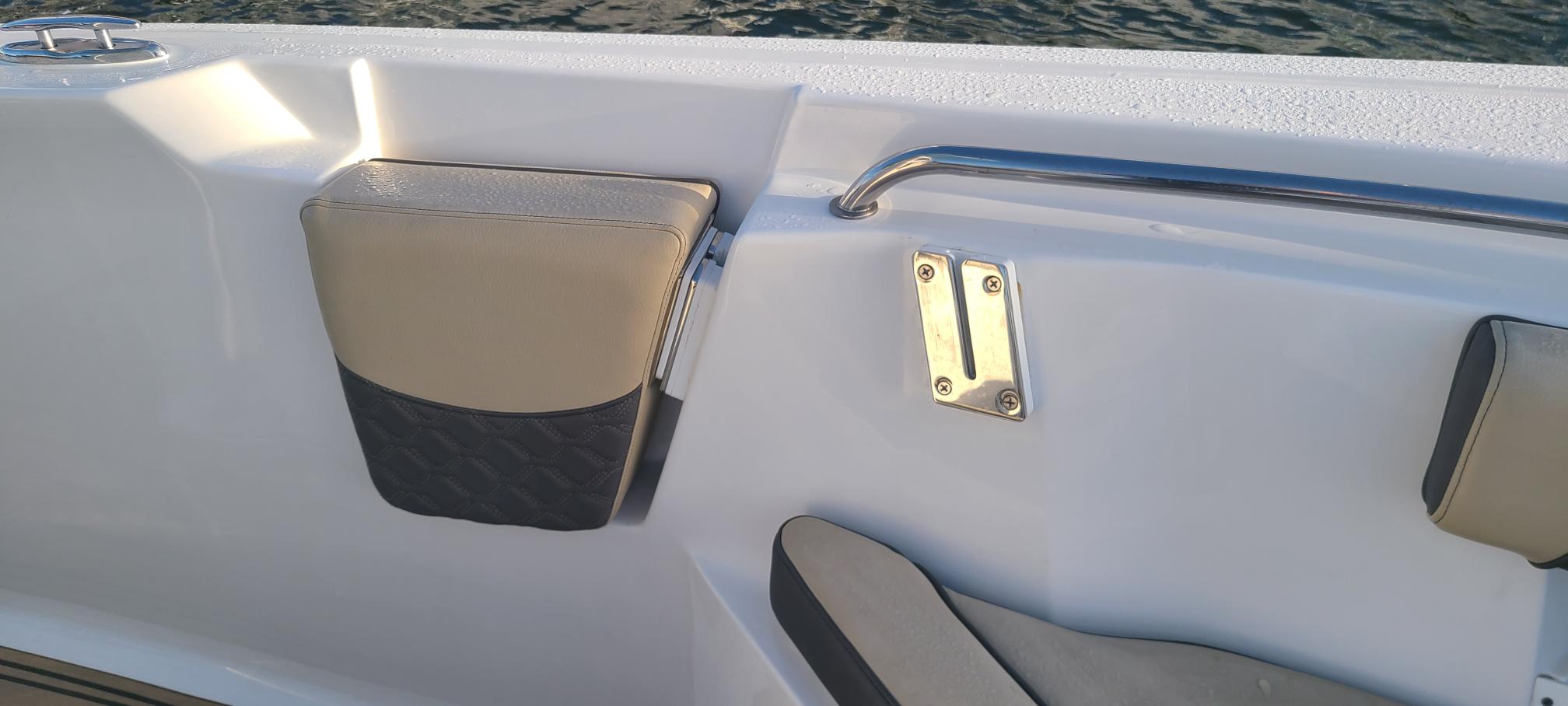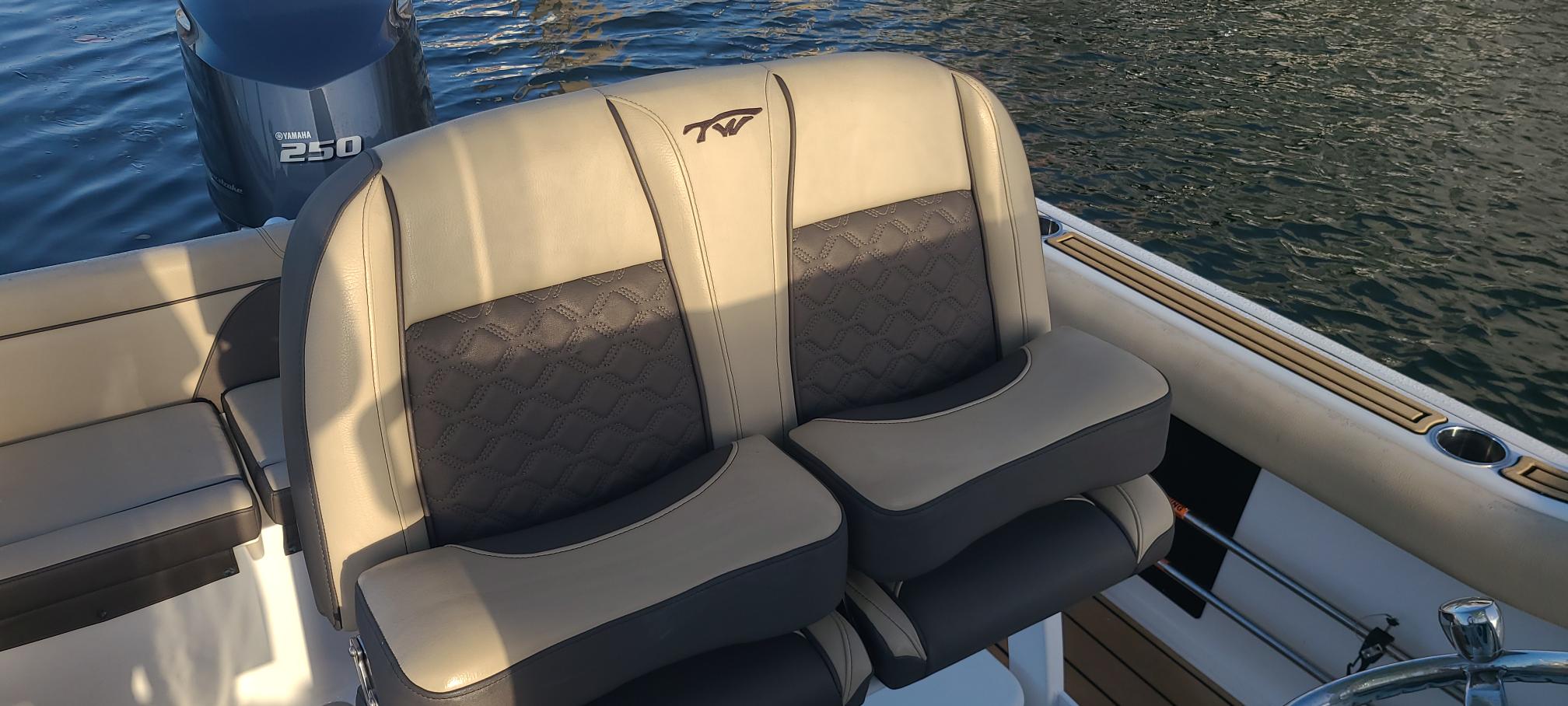 Cockpit Bolsters, Custom Hinged Bow Backrest (Pair), Fold-Down Rear Seat, Port and Starboard Bow Cushions, Console with Companion Footrest & Black Dash Panel