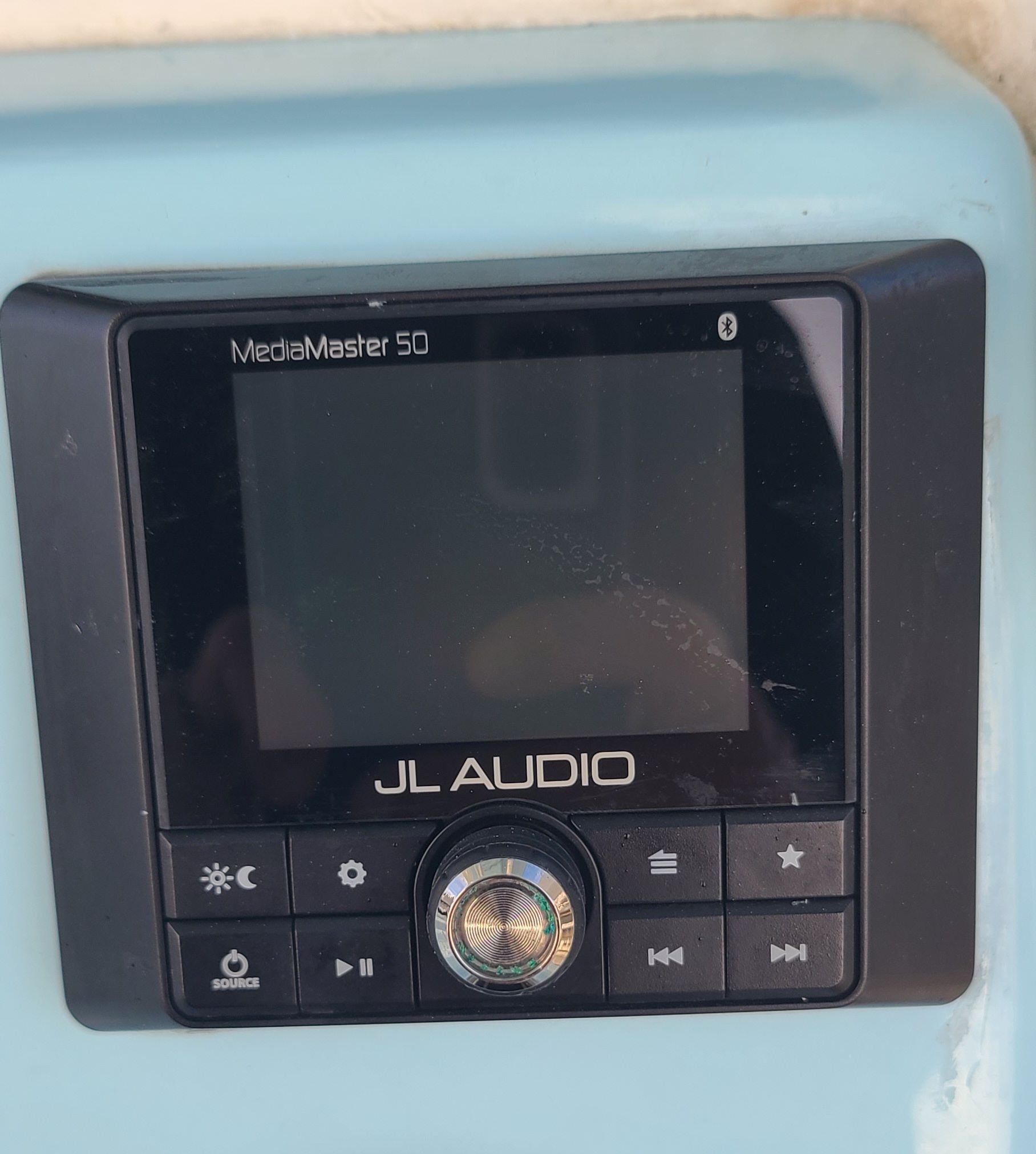 Deluxe Drop Bolster Leaning Post, Fiberglass T-Top with Full Glass Enclosure, Hard Top White, JL MM 50 w/ (4) M3 JL Speakers, 30 Gal. Insulated Livewell