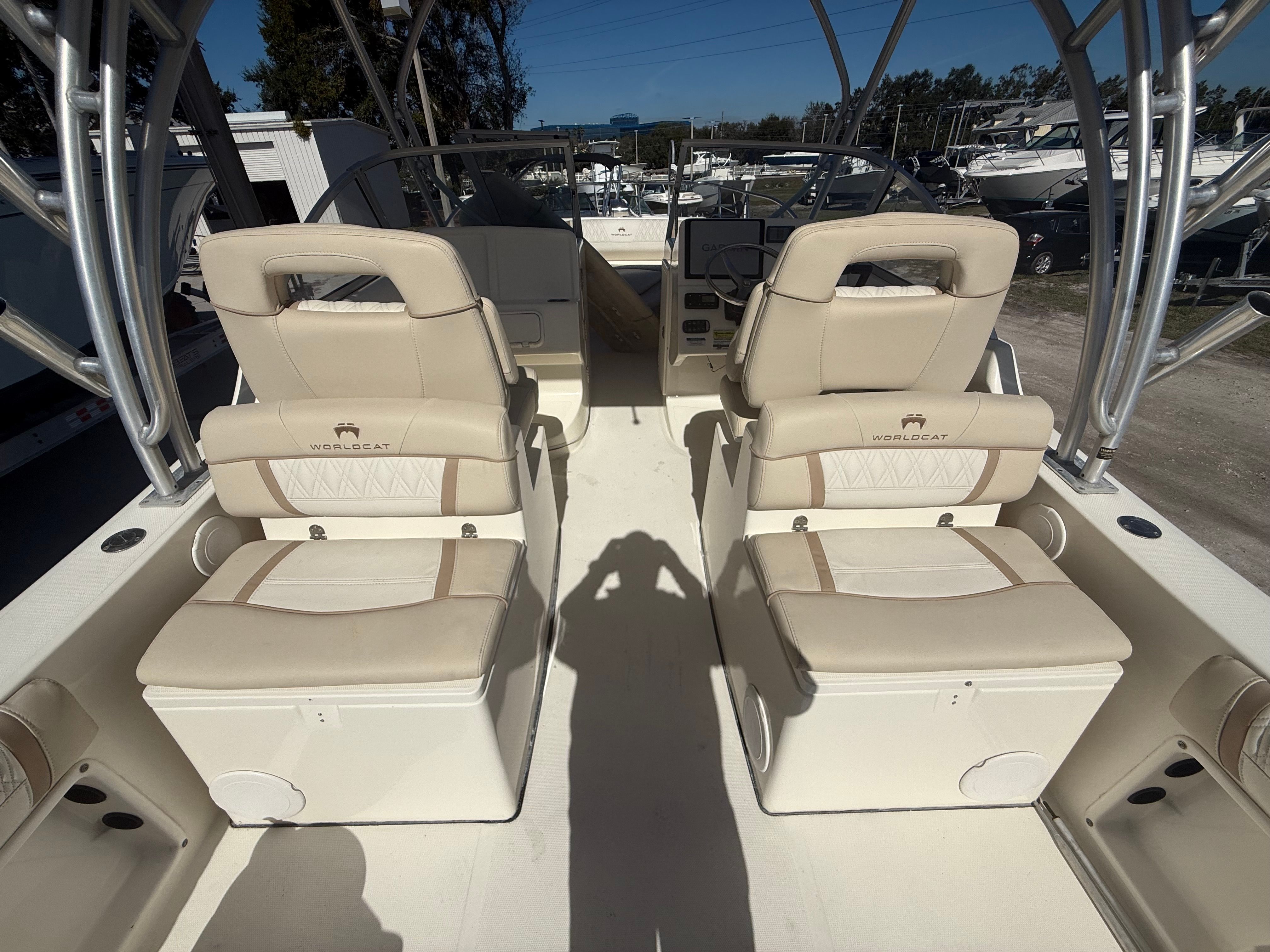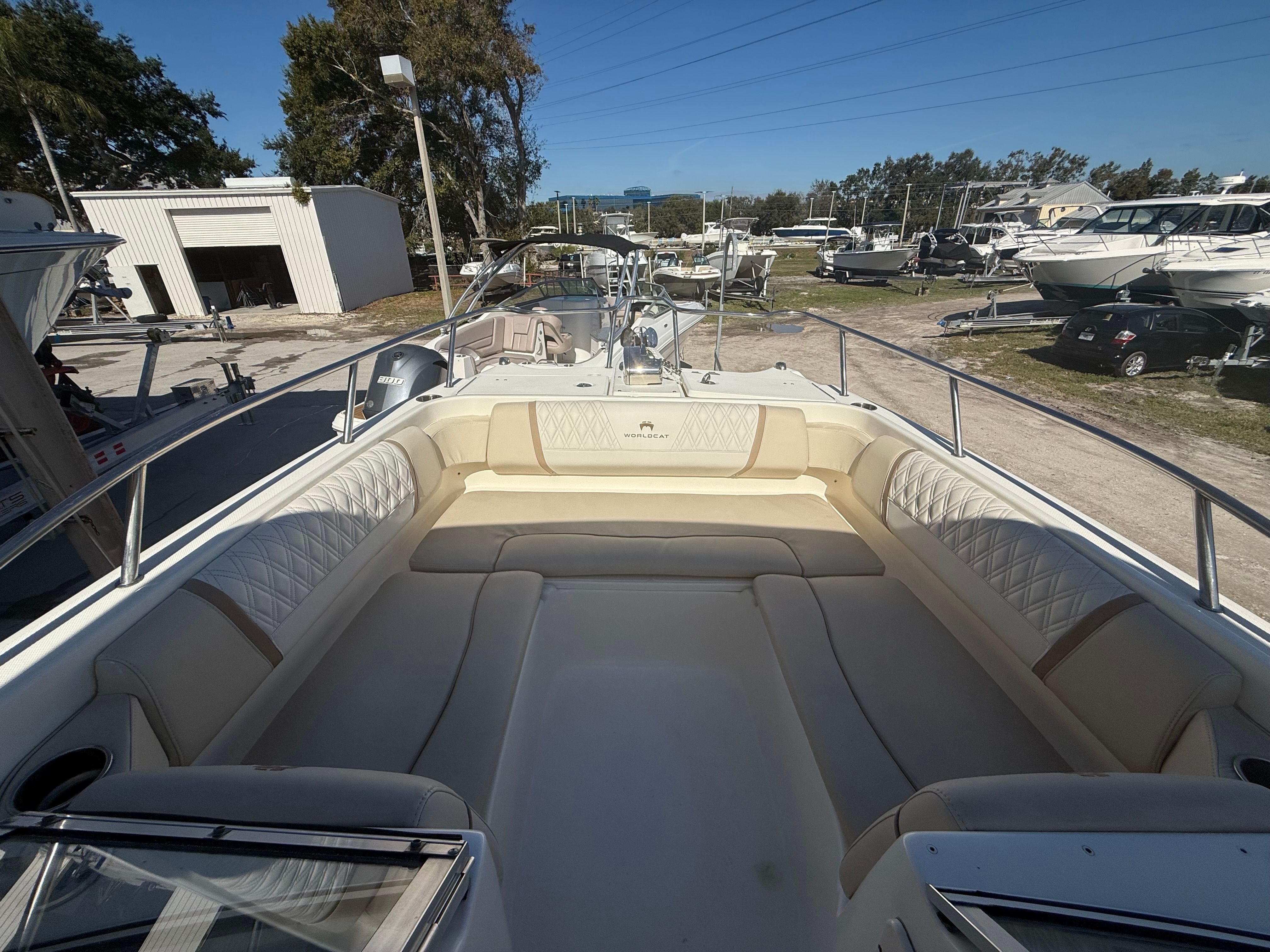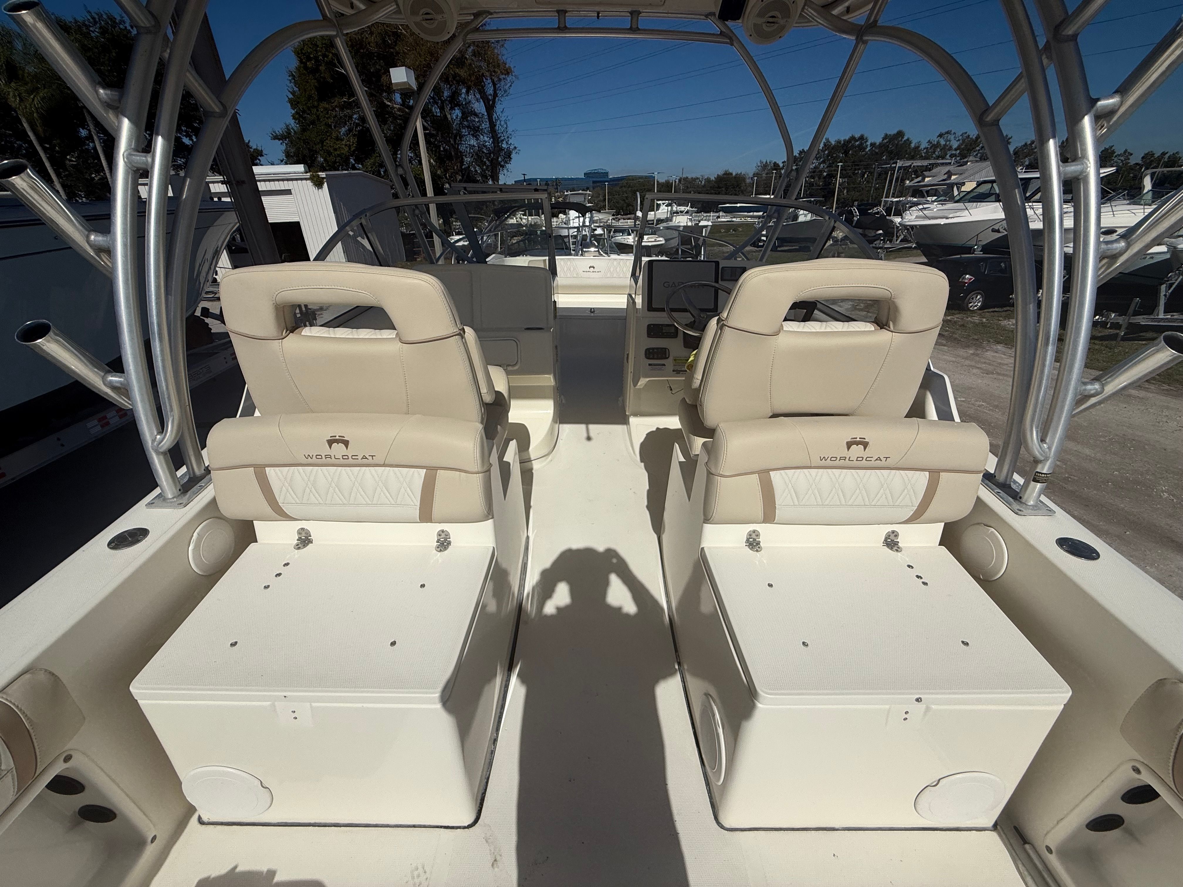 This World Cat boat for sale is as practical as it is enjoyable. The ample storage options make it easy to stow fishing gear, water toys, and personal belongings, keeping the deck clutter-free and organized. The Dual Console configuration simplifies docking and boarding, while the efficient twin engines contribute to fuel savings and reduced operating costs. Whether you are navigating busy marinas or anchoring in secluded coves, the 255 DC is designed to make every aspect of boat ownership more convenient and enjoyable.